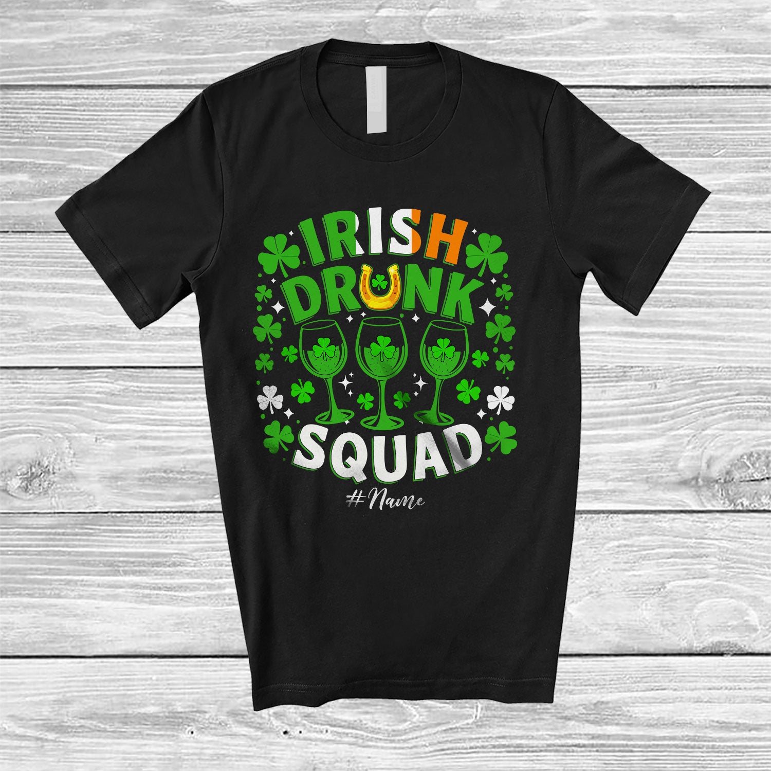 • Personalized Custom Name Irish Drunk Squad; Cheerful St. Patrick's Day Wine Drinking; Shamrock T-Shirt. This cotton t-shirt is a durable staple product with a classic fit. One of the most popular items, it has a relaxed style made for everyday and casual wear.