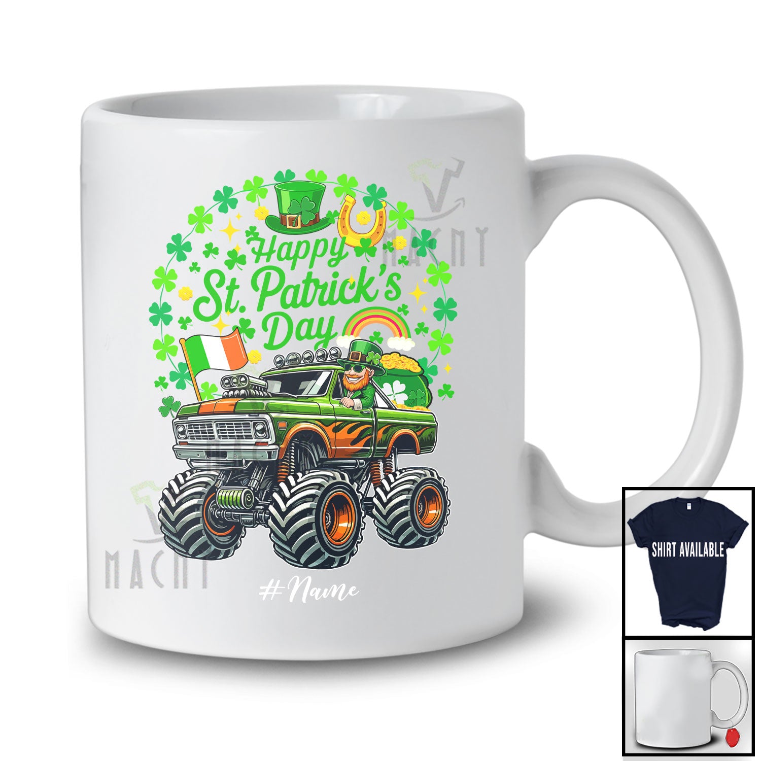• Personalized Happy St. Patrick's Day; Joyful Leprechaun Driving Monster Truck; Custom Name Driver T-Shirt. This cotton t-shirt is a durable staple product with a classic fit. One of the most popular items, it has a relaxed style made for everyday and casual wear.