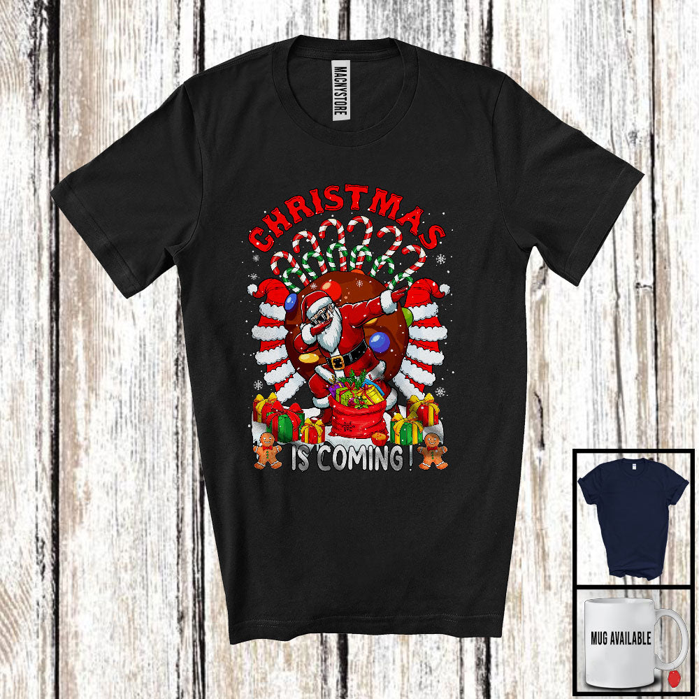 Christmas Is Coming; Adorable X-mas Dabbing Santa Hat Candy Cane; Family Group T-Shirt. This cotton t-shirt is a durable staple product with a classic fit. One of the most popular items, it has a relaxed style made for everyday and casual wear.