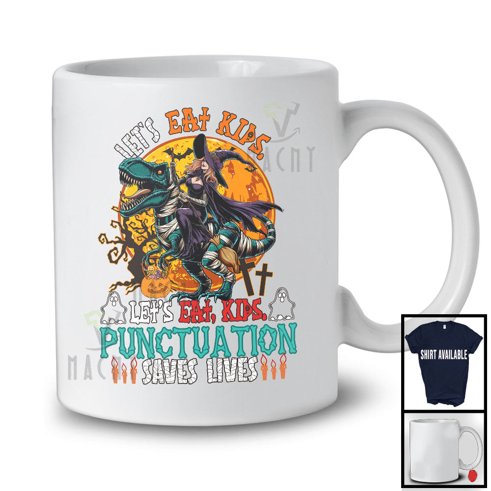 Eat Kids Punctuation Saves Lives, Humorous Halloween Witch Riding T-Rex, Teacher Dinosaur T-Shirt