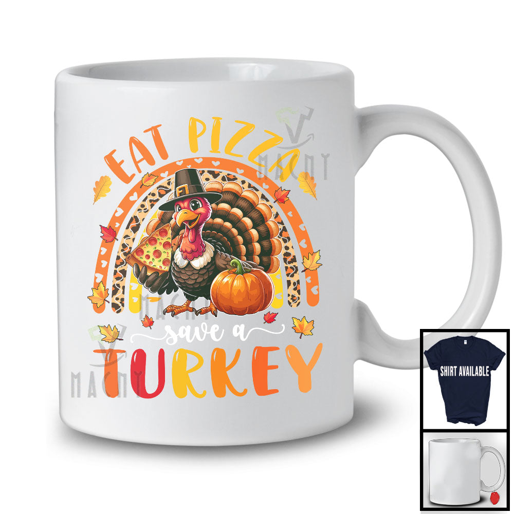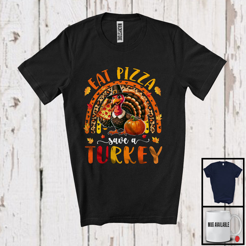 Eat Pizza Save A Turkey; Humorous Thanksgiving Turkey With Pizza; Leopard Rainbow T-Shirt. This cotton t-shirt is a durable staple product with a classic fit. One of the most popular items, it has a relaxed style made for everyday and casual wear.