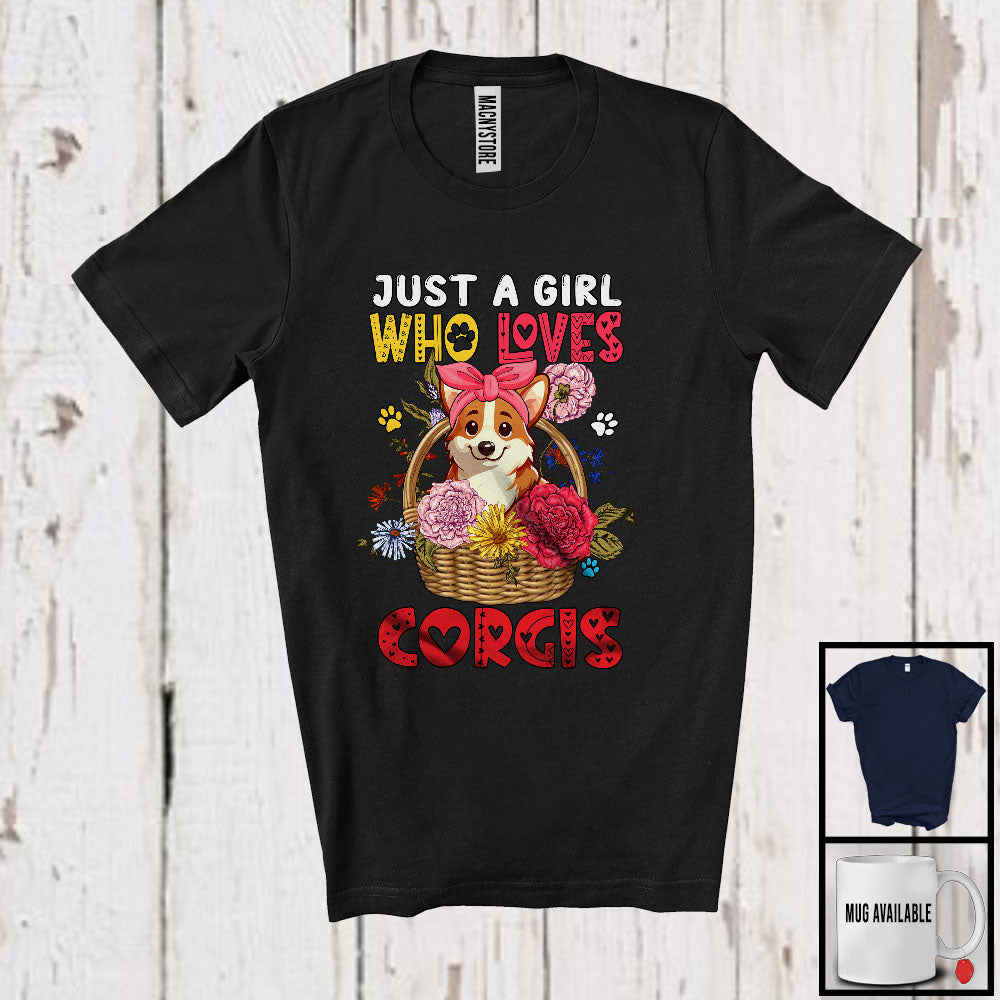 Just A Girl Who Loves Corgis; Adorable Dog In Floral Flowers Basket; Family Group T-Shirt. This cotton t-shirt is a durable staple product with a classic fit. One of the most popular items, it has a relaxed style made for everyday and casual wear.