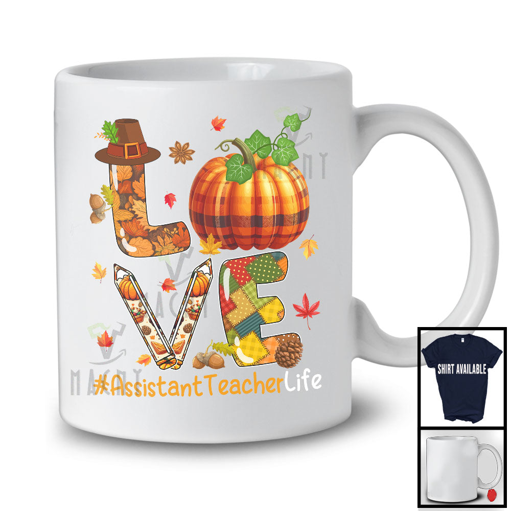 LOVE Assistant Teacher; Amazing Thanksgiving Fall Leaves Plaid Pumpkin Pencil; Careers Jobs T-Shirt