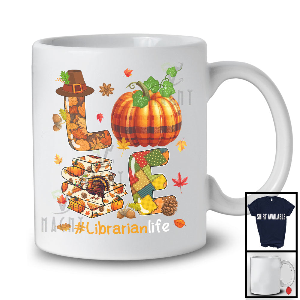 LOVE Librarian; Amazing Thanksgiving Fall Leaves Plaid Pumpkin Books; Librarian Careers Jobs T-Shirt