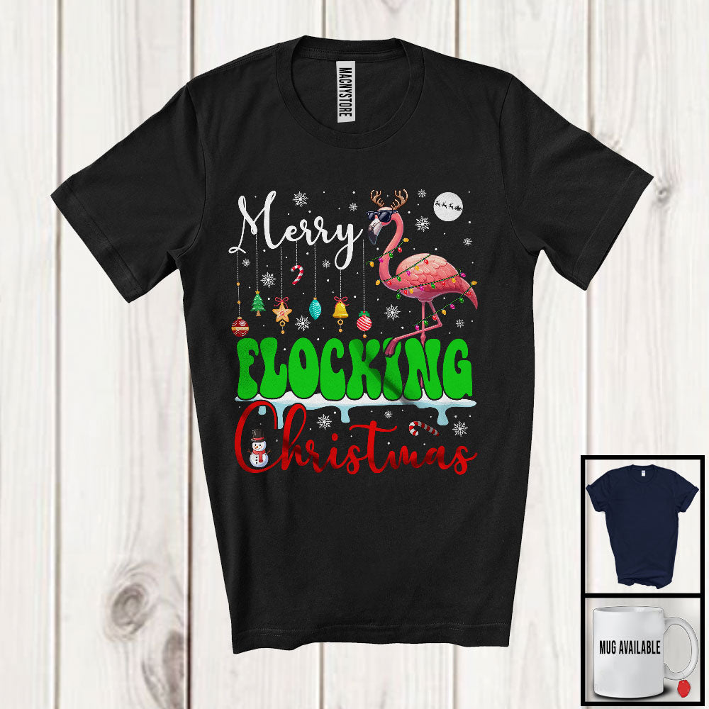Merry Flocking Christmas; Cheerful X-mas Lights Santa Flamingo Snowing; Bird Family Group T-Shirt. This cotton t-shirt is a durable staple product with a classic fit. One of the most popular items, it has a relaxed style made for everyday and casual wear.