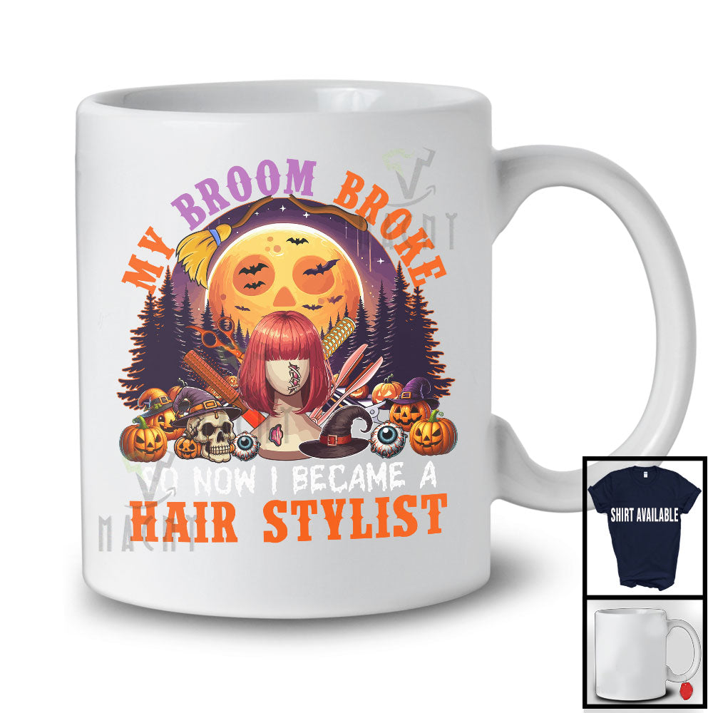 My Broom Broke I Became A Hair Stylist, Happy Halloween Moon Witch, Skull Carved Pumpkins T-Shirt. This cotton t-shirt is a durable staple product with a classic fit. One of the most popular items, it has a relaxed style made for everyday and casual wear.