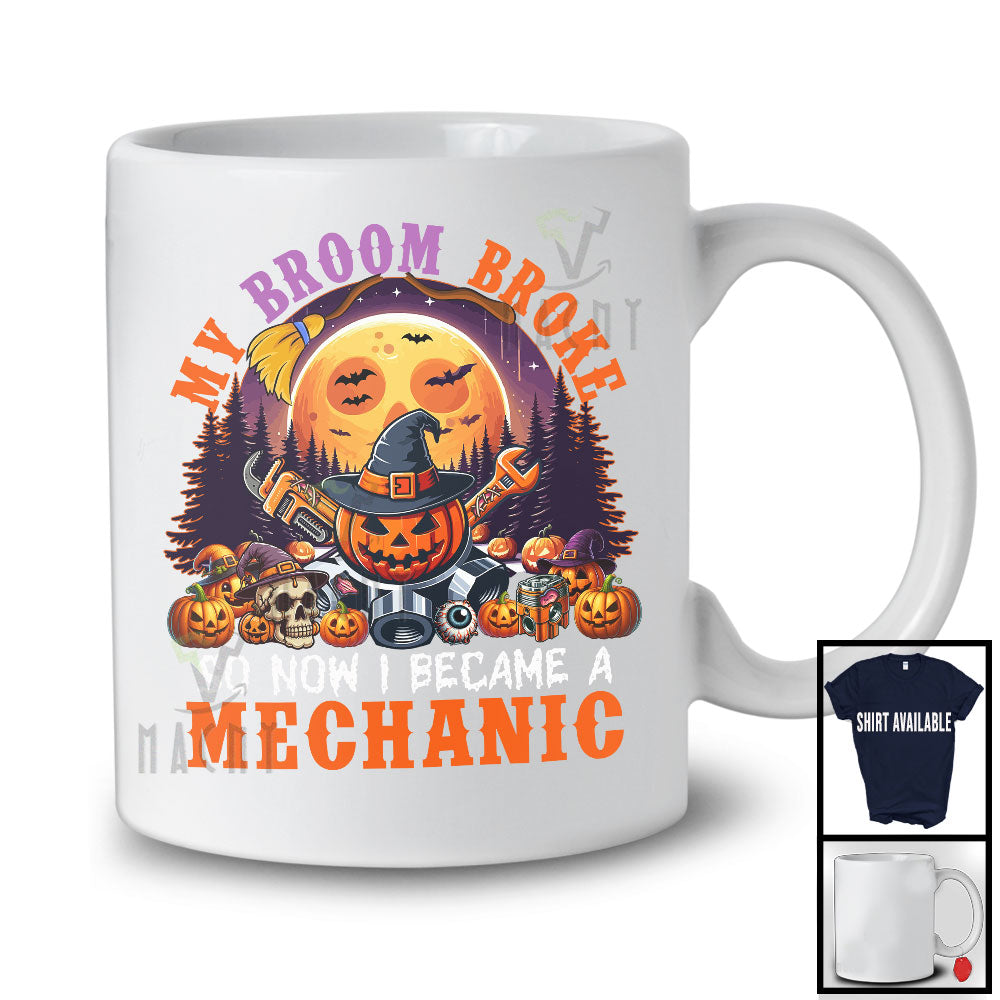 new MacnyStore - My Broom Broke I Became A Mechanic, Happy Halloween Moon Witch, Skull Carved Pumpkins T-Shirt – Macnystore