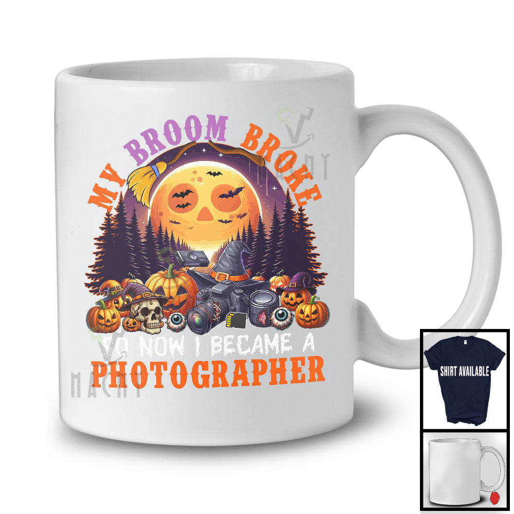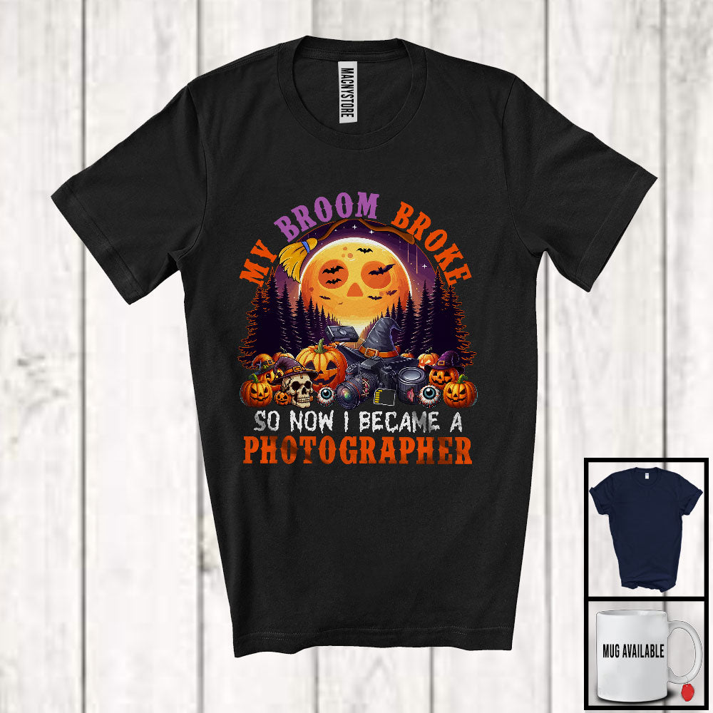 • My Broom Broke I Became A Photographer, Happy Halloween Moon Witch, Skull Carved Pumpkins T-Shirt. This cotton t-shirt is a durable staple product with a classic fit. One of the most popular items, it has a relaxed style made for everyday and casual wear.