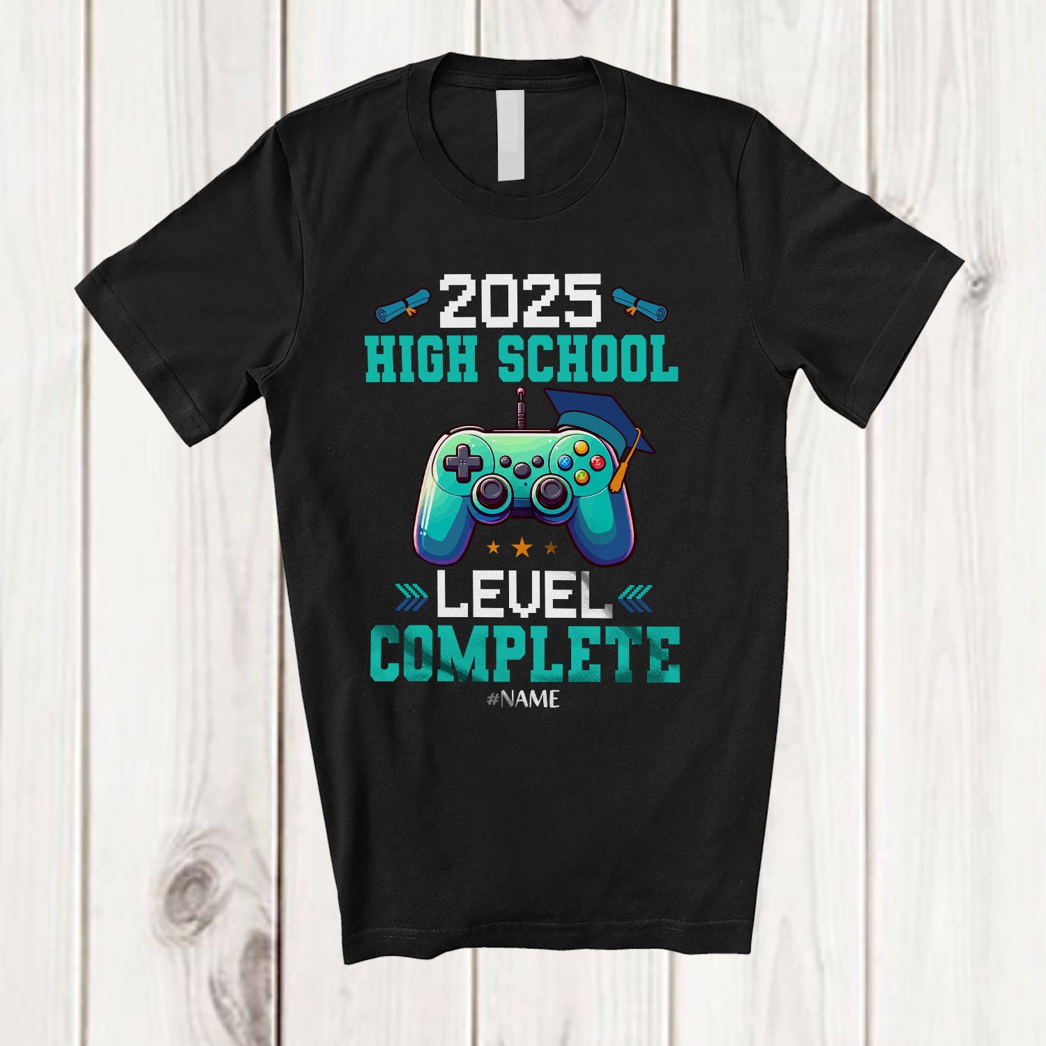Personalized 2025 High School Level Complete; Joyful Graduation Summer Custom Name Gamer T-Shirt. This cotton t-shirt is a durable staple product with a classic fit. One of the most popular items, it has a relaxed style made for everyday and casual wear.