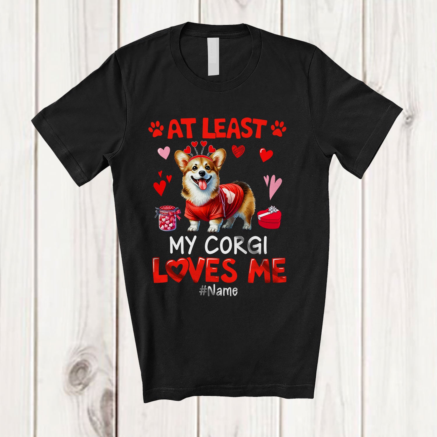 Personalized At Least My Corgi Loves Me; Lovely Valentine Hearts; Custom Name Single Family T-Shirt