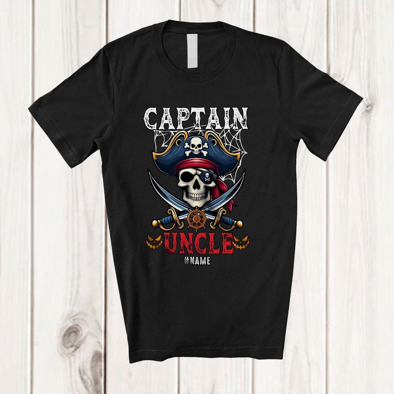 • Personalized Captain Uncle; Amazing Halloween Costume Pirate Skull; Custom Name Family T-Shirt. This cotton t-shirt is a durable staple product with a classic fit. One of the most popular items, it has a relaxed style made for everyday and casual wear.