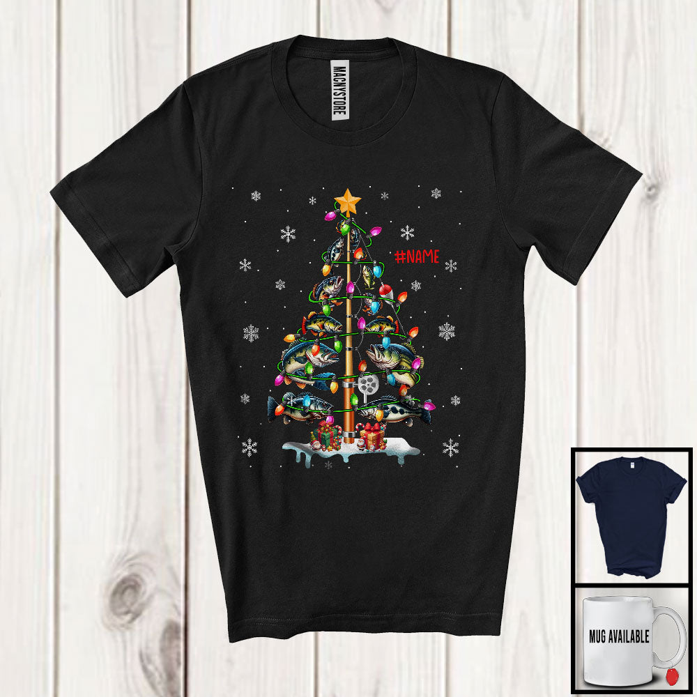 Personalized Christmas Tree Bass Fish; Amazing X-mas Fish Fishing Lover; Custom Name Fisher Group T-Shirt