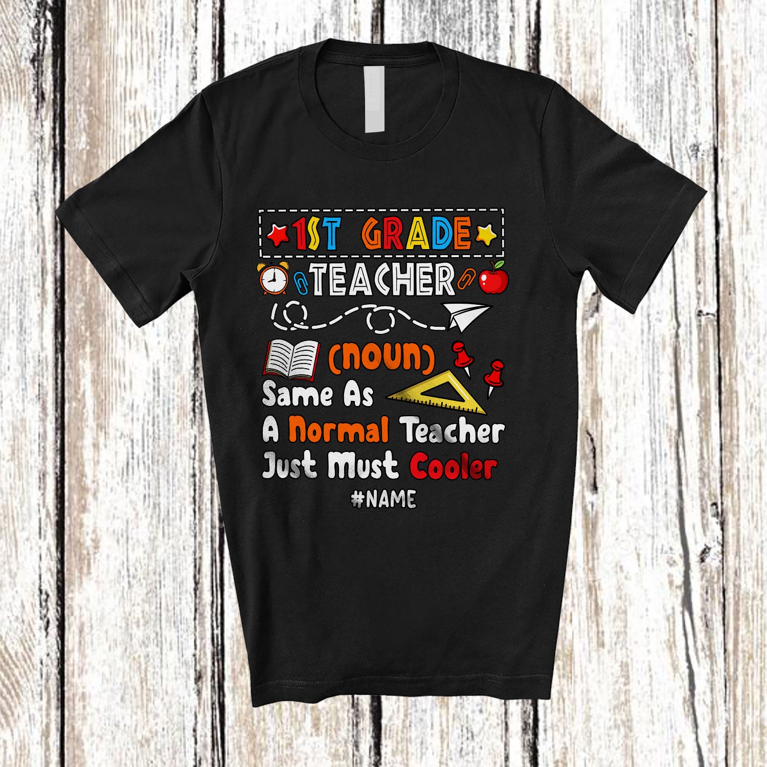 Personalized Custom Name 1st Grade Teacher Definition; Amusing First Day Of School Teaching T-Shirt. This cotton t-shirt is a durable staple product with a classic fit. One of the most popular items, it has a relaxed style made for everyday and casual wear.