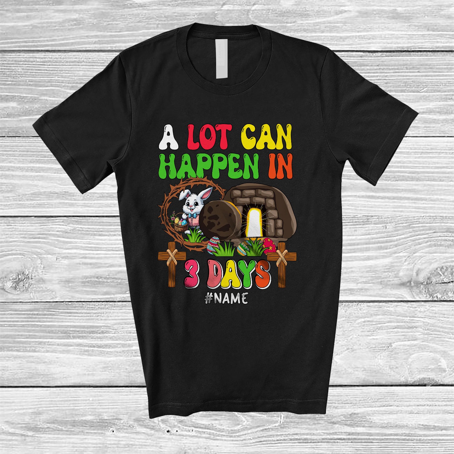 • Personalized Custom Name A Lot Can Happen In 3 Days; Lovely Easter Jesus Coming; Bunny Family T-Shirt. This cotton t-shirt is a durable staple product with a classic fit. One of the most popular items, it has a relaxed style made for everyday and casual wear.