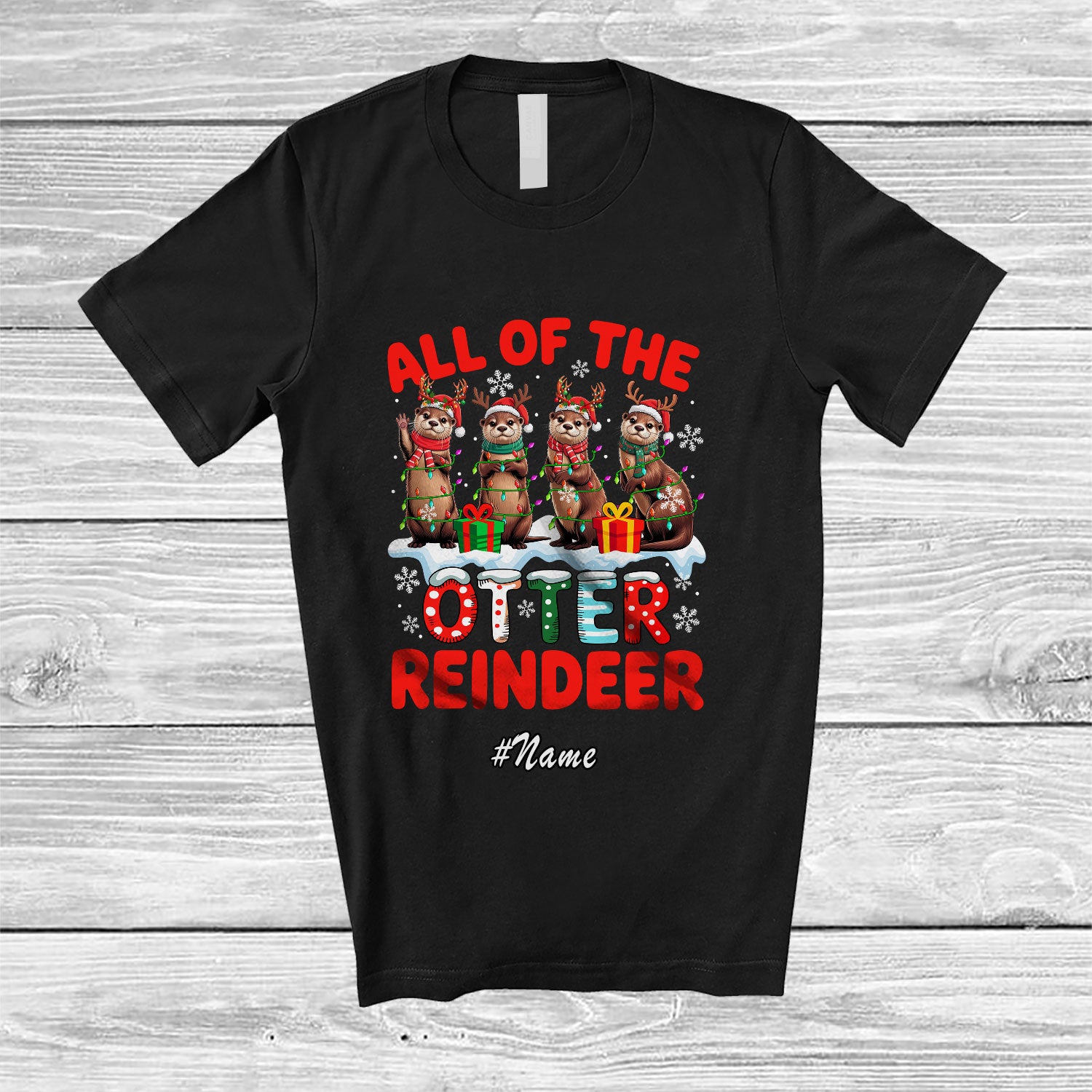 • Personalized Custom Name All Of Otter Reindeer; Lovely Christmas Lights Santa Otter Squad T-Shirt. This cotton t-shirt is a durable staple product with a classic fit. One of the most popular items, it has a relaxed style made for everyday and casual wear.