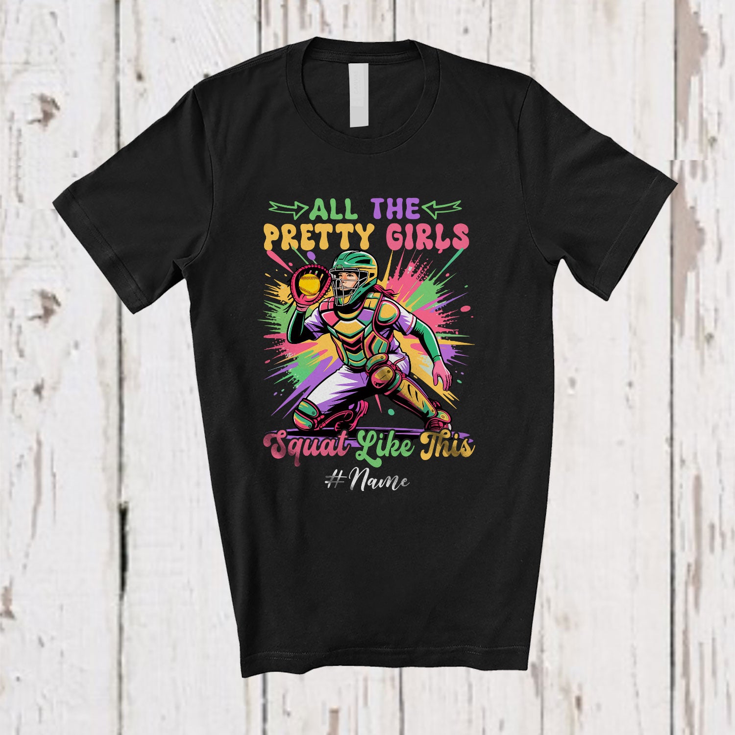 • Personalized Custom Name All The Pretty Girls Squat Like This; Colorful Softball Catcher Player Team T-Shirt. This cotton t-shirt is a durable staple product with a classic fit. One of the most popular items, it has a relaxed style made for everyday and casual wear.