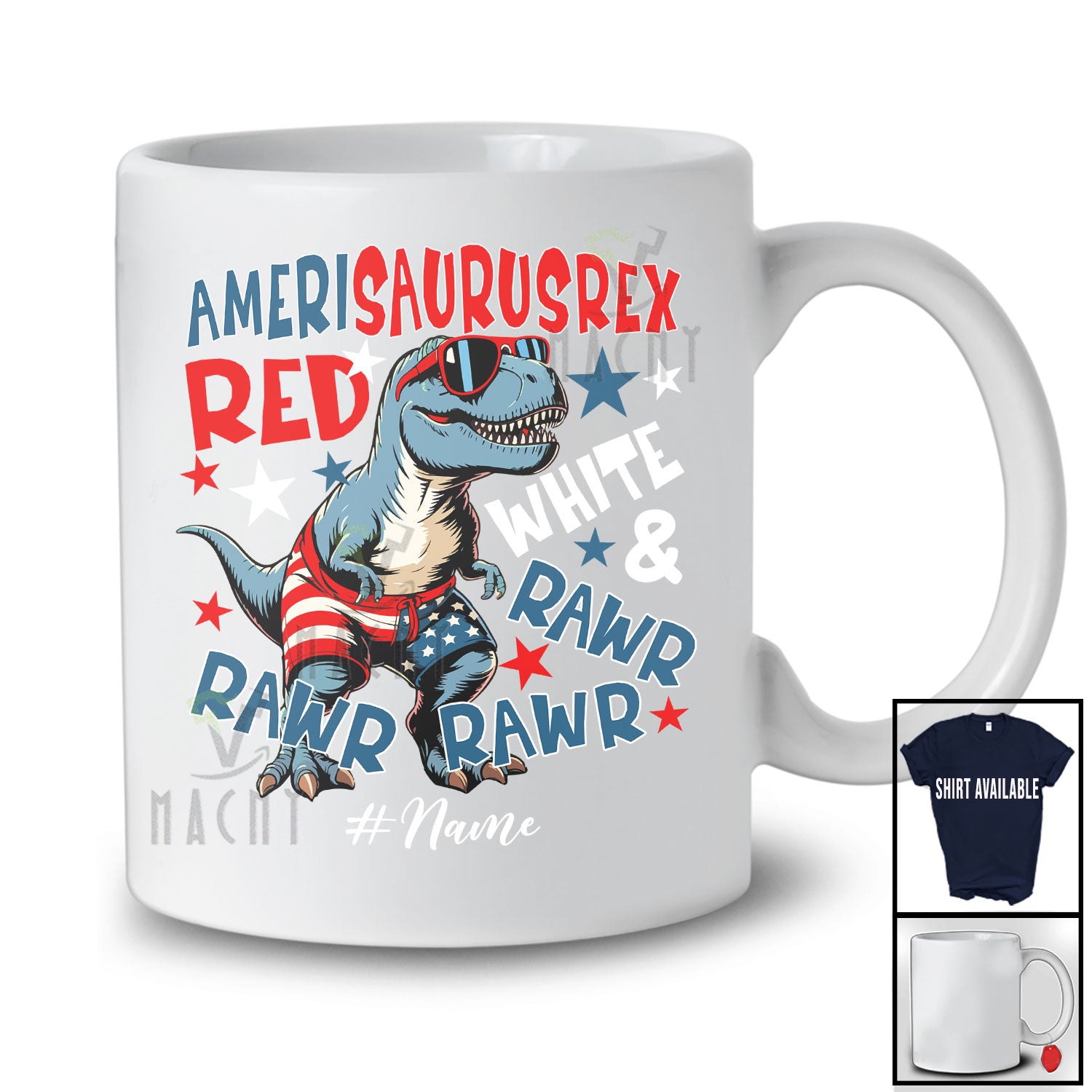 Personalized Custom Name Amerisaurus Rex Rawr; Humorous 4th Of July T-Rex; Patriotic T-Shirt. This cotton t-shirt is a durable staple product with a classic fit. One of the most popular items, it has a relaxed style made for everyday and casual wear.