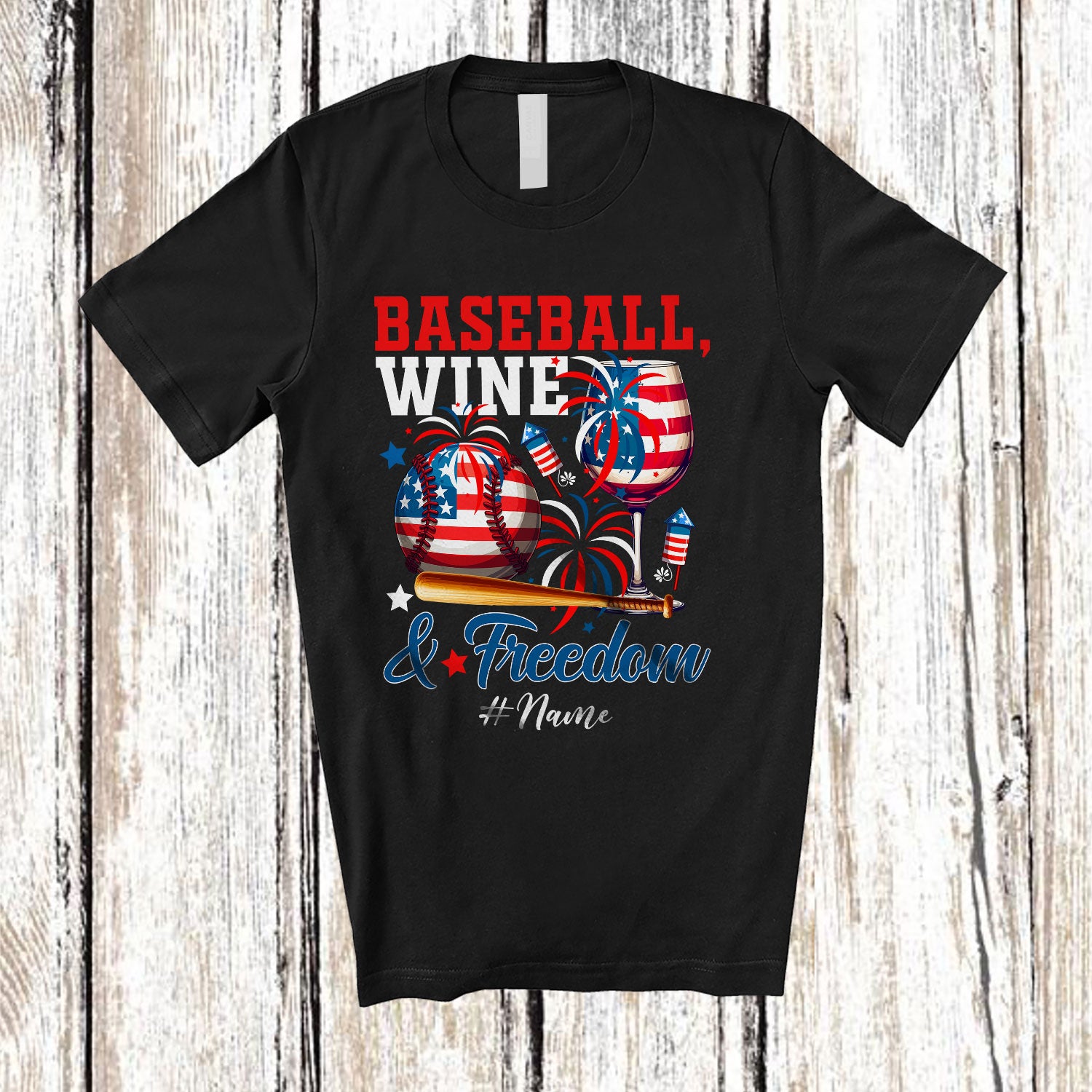 Personalized Custom Name Baseball Wine Freedom; Joyful 4th of July Drinking Player; Patriotic T-Shirt. This cotton t-shirt is a durable staple product with a classic fit. One of the most popular items, it has a relaxed style made for everyday and casual wear.