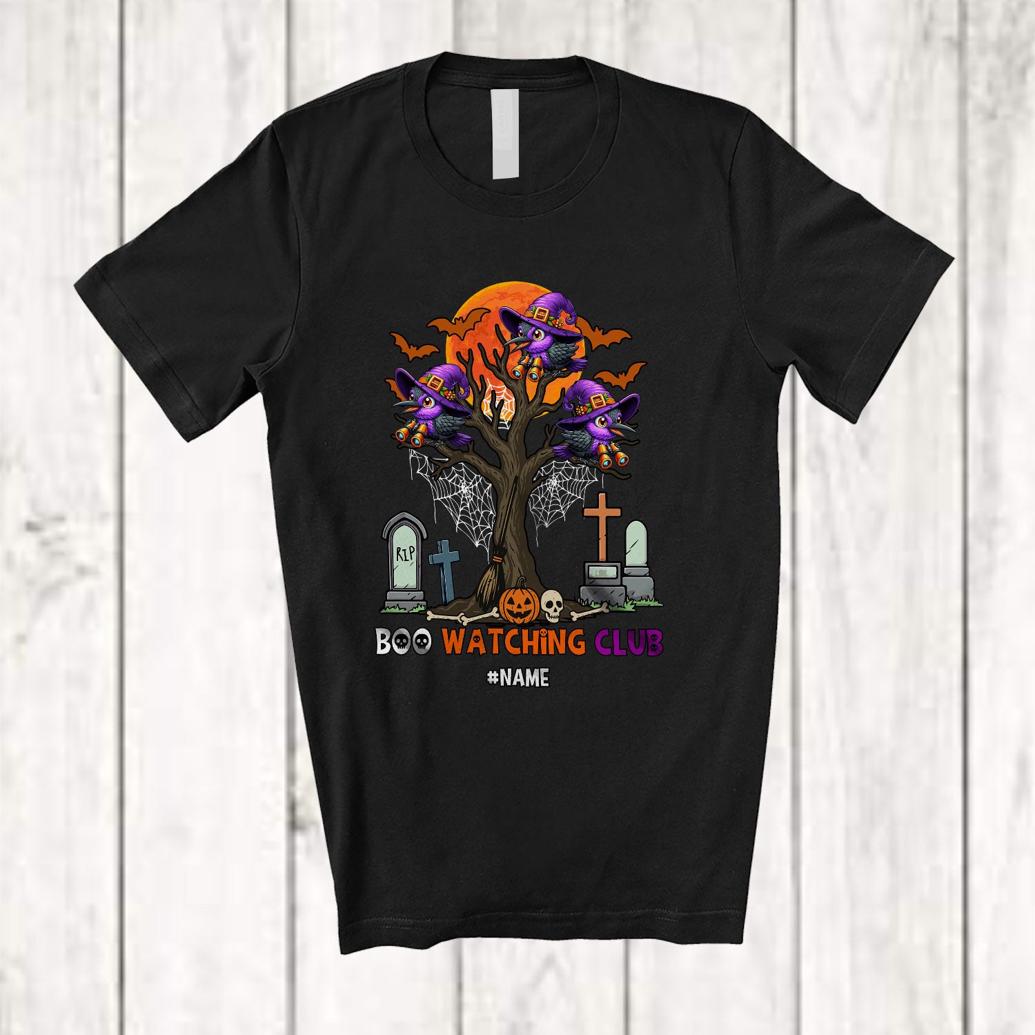 • Personalized Custom Name Boo Watching Club; Scary Halloween Hummingbird Witch On Tree; Bird Lover T-Shirt. This cotton t-shirt is a durable staple product with a classic fit. One of the most popular items, it has a relaxed style made for everyday and casual wear.