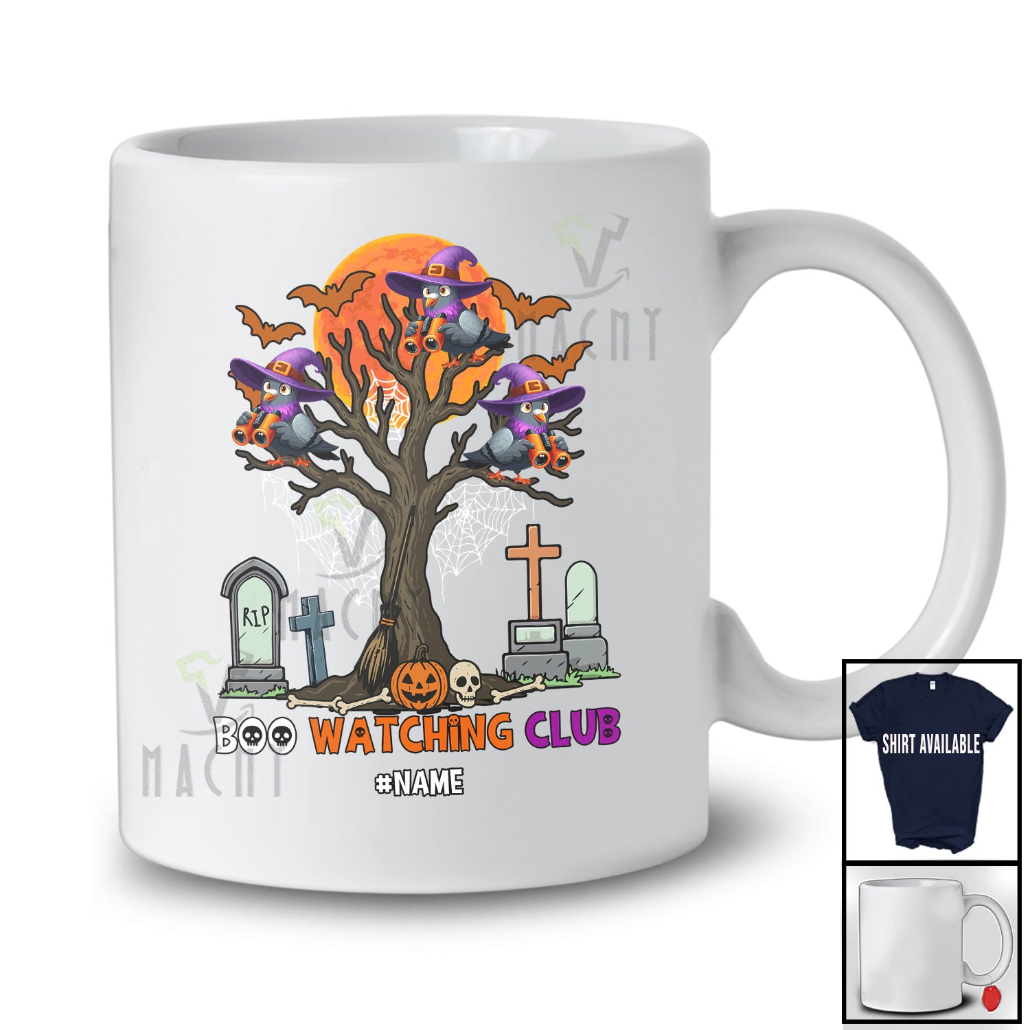Personalized Custom Name Boo Watching Club; Scary Halloween Pigeon Witch On Tree; Bird Lover T-Shirt. This cotton t-shirt is a durable staple product with a classic fit. One of the most popular items, it has a relaxed style made for everyday and casual wear.