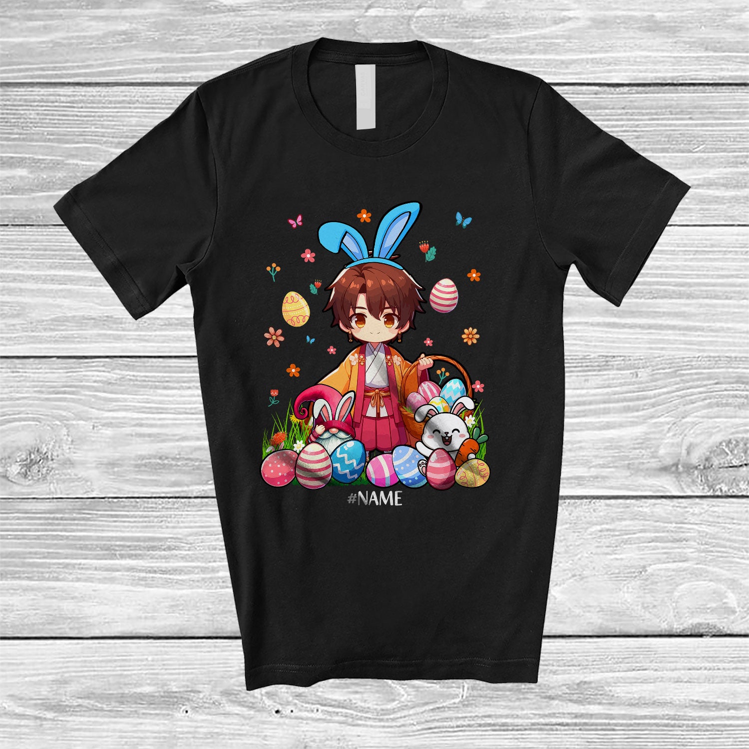 Personalized Custom Name Bunny Japanese Anime Boy; Adorable Easter Bunny Hunting Eggs; Flowers T-Shirt. This cotton t-shirt is a durable staple product with a classic fit. One of the most popular items, it has a relaxed style made for everyday and casual wear.