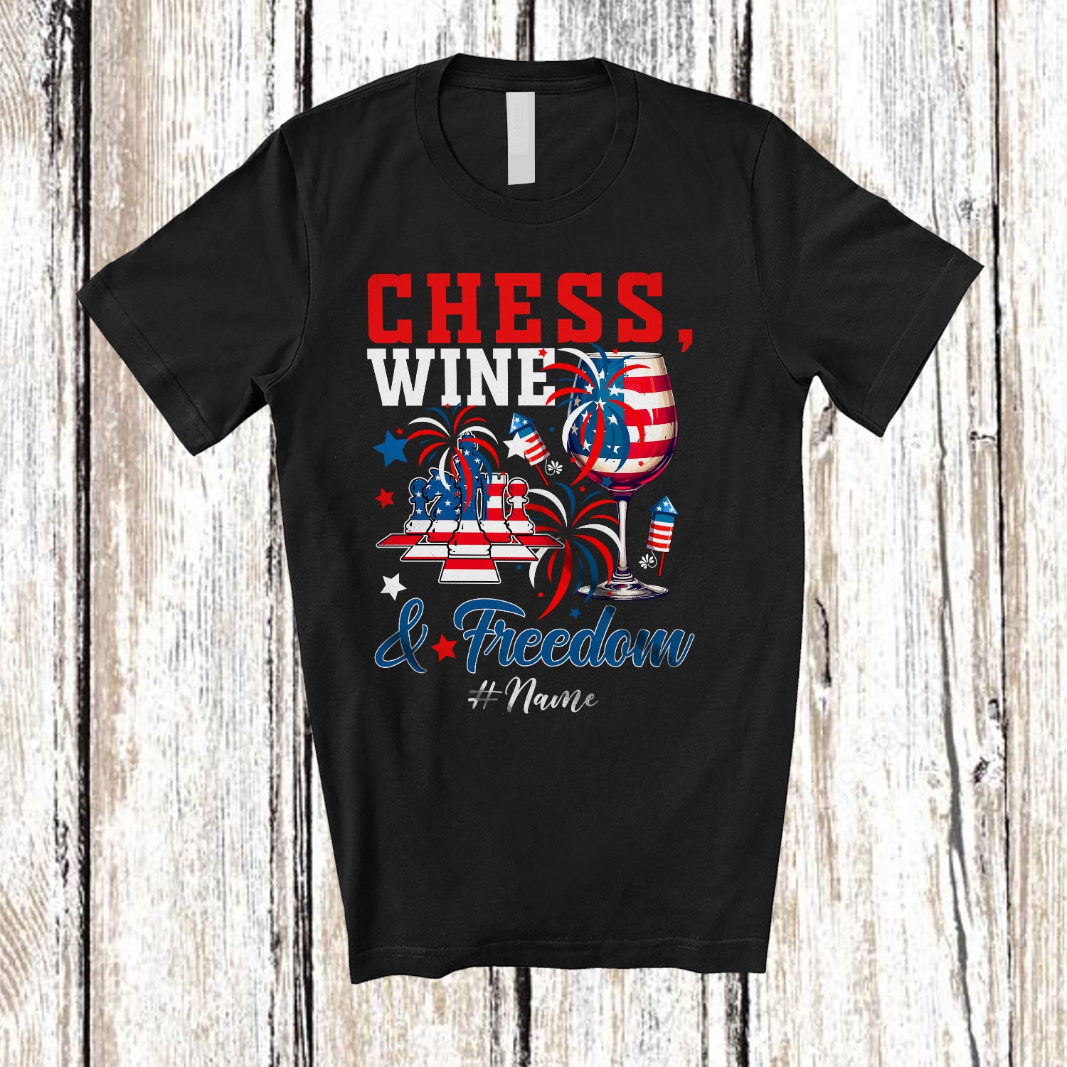 Personalized Custom Name Chess Wine Freedom; Joyful 4th of July Drinking Chess Player; Patriotic T-Shirt. This cotton t-shirt is a durable staple product with a classic fit. One of the most popular items, it has a relaxed style made for everyday and casual wear.