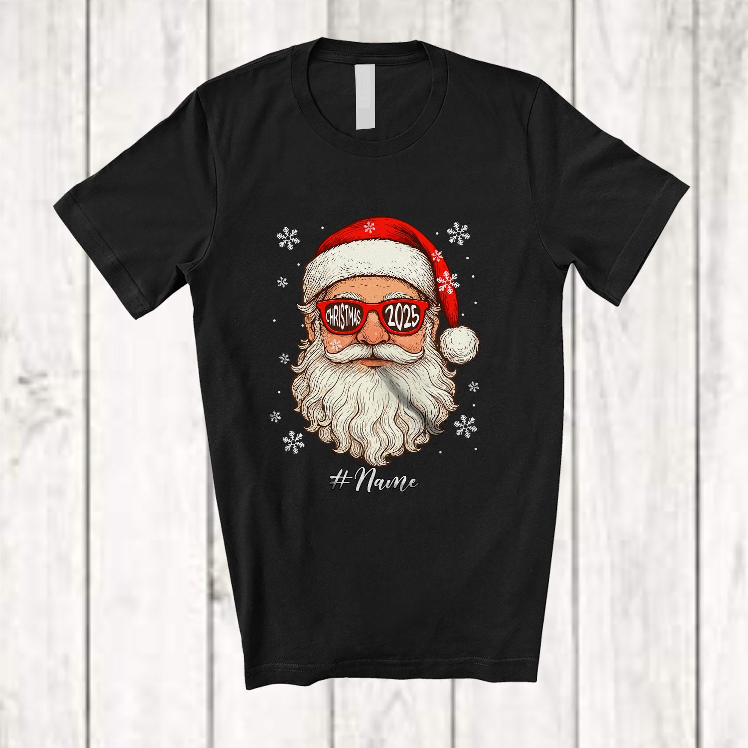 Personalized Custom Name Christmas 2025; Fantastic X-mas Santa Face Sunglasses; Family T-Shirt. This cotton t-shirt is a durable staple product with a classic fit. One of the most popular items, it has a relaxed style made for everyday and casual wear.