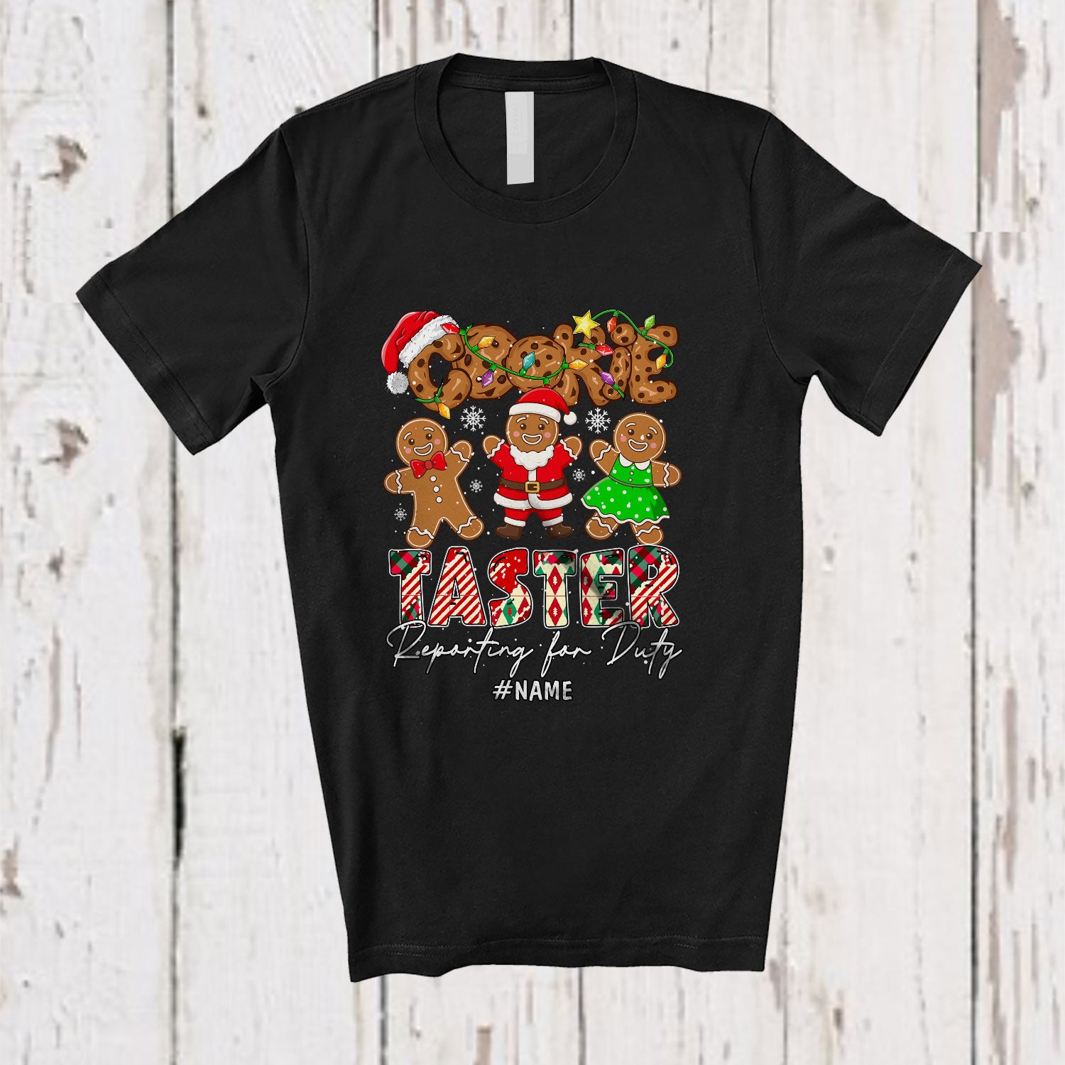 Personalized Custom Name Cookie Taster Reporting For Duty; Lovely Christmas Plaid Baker T-Shirt. This cotton t-shirt is a durable staple product with a classic fit. One of the most popular items, it has a relaxed style made for everyday and casual wear.