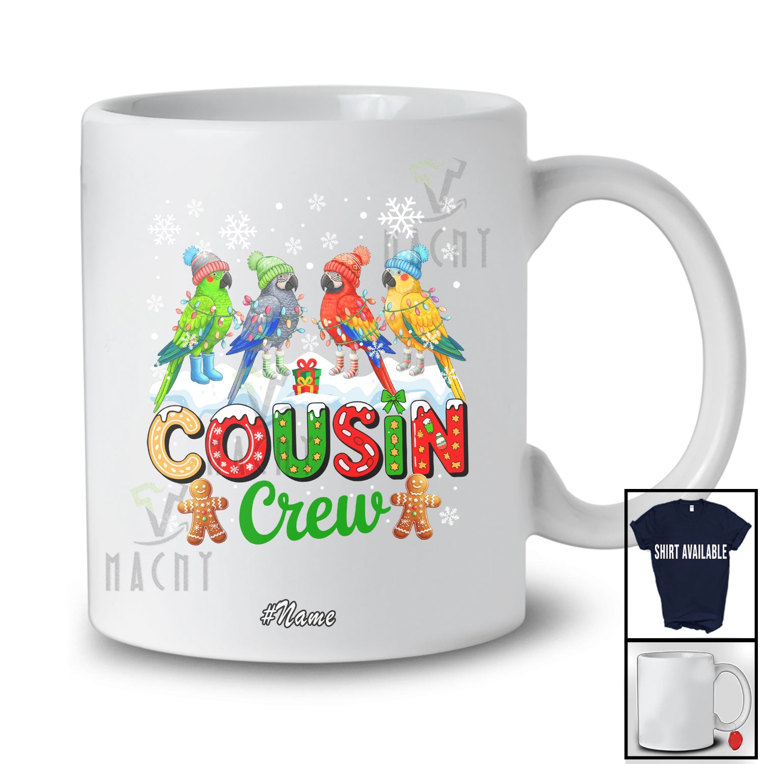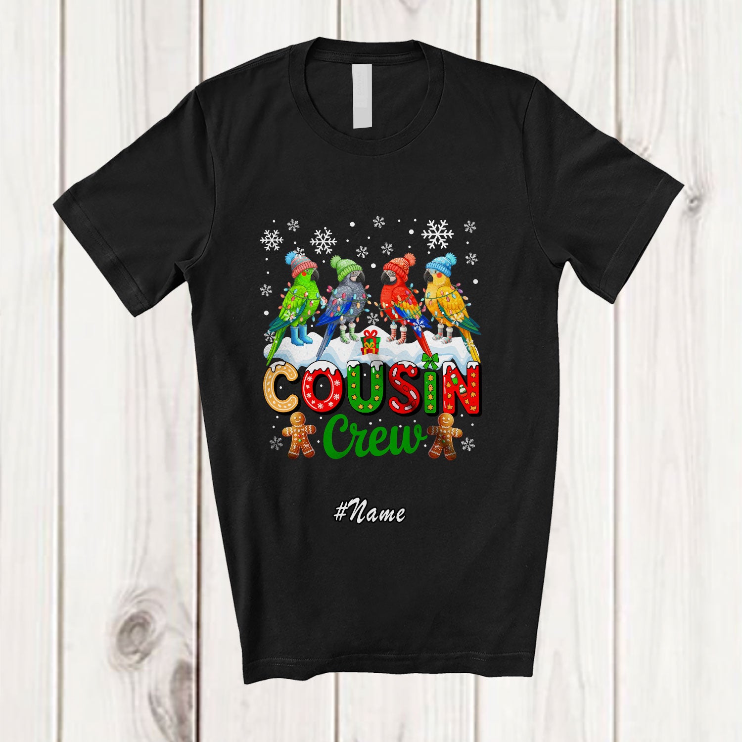 • Personalized Custom Name Cousin Crew; Lovely Christmas Lights Four Parrot X-mas; Bird T-Shirt. This cotton t-shirt is a durable staple product with a classic fit. One of the most popular items, it has a relaxed style made for everyday and casual wear.