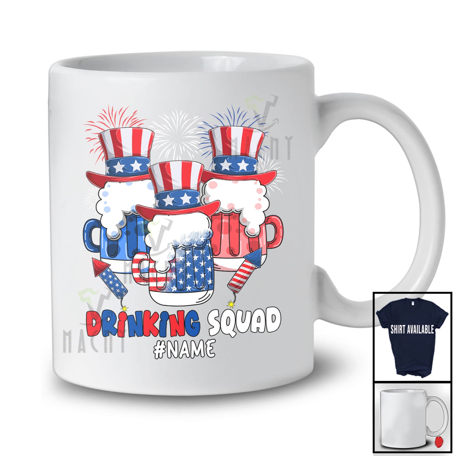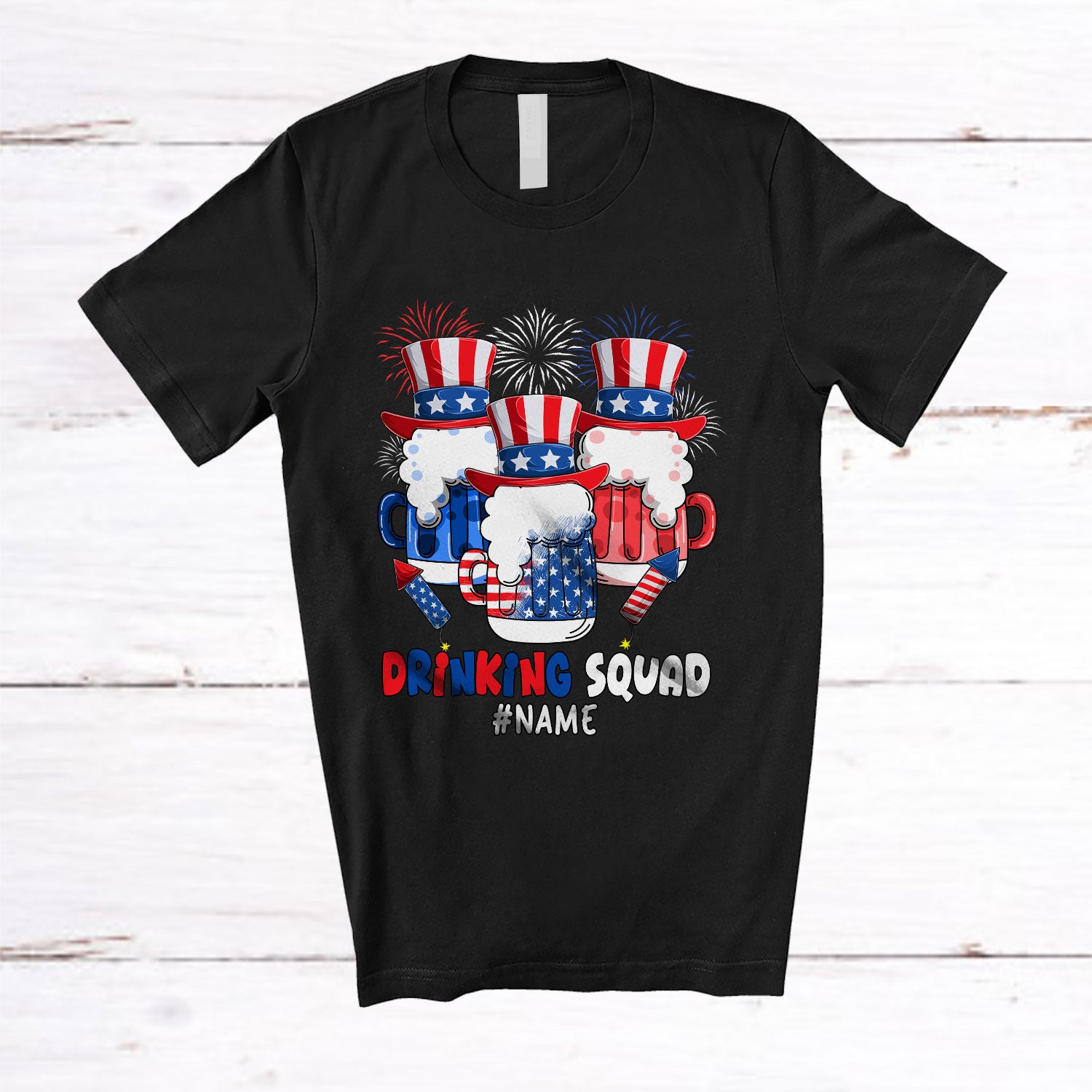 Personalized Custom Name Drinking Squad; Fantastic 4th Of July Three Glasses of Beer; Patriotic T-Shirt. This cotton t-shirt is a durable staple product with a classic fit. One of the most popular items, it has a relaxed style made for everyday and casual wear.