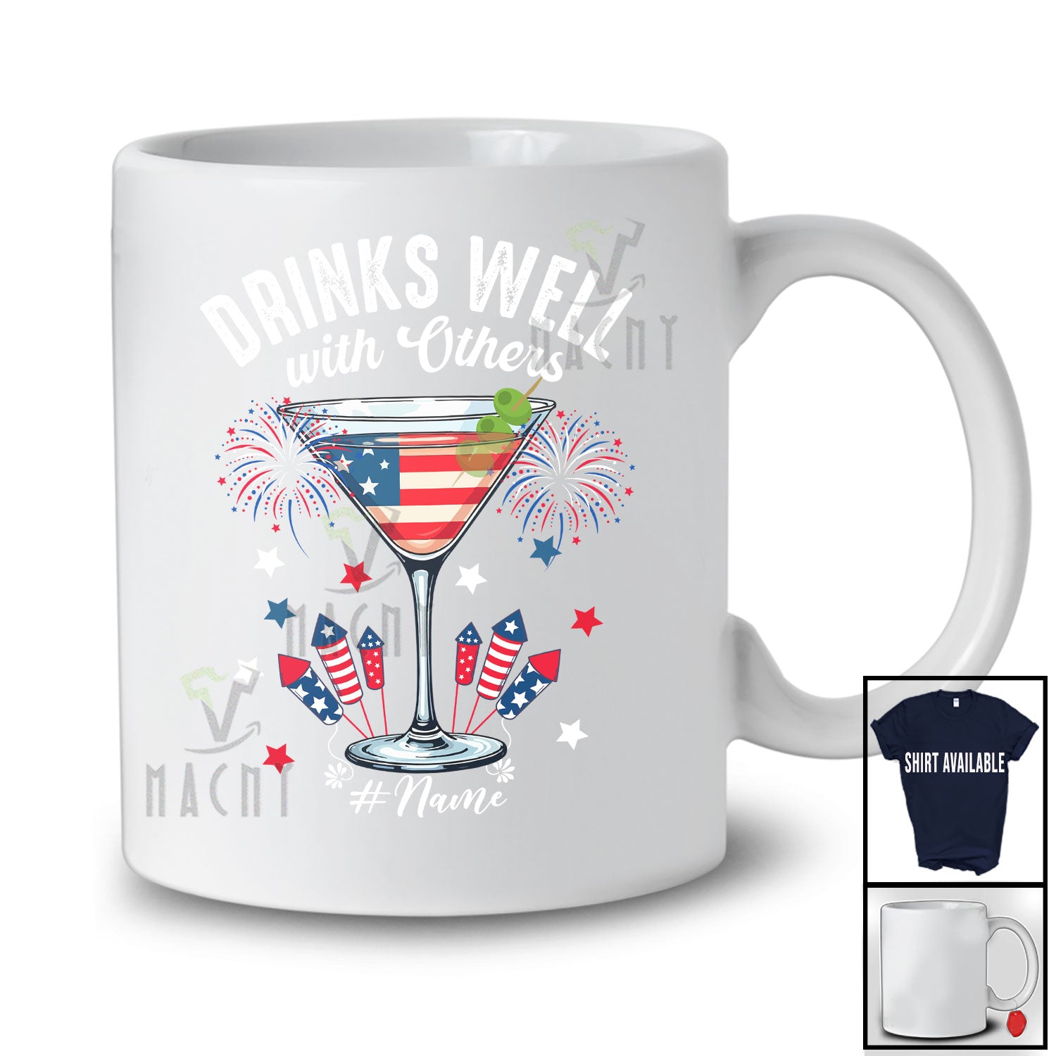 • Personalized Custom Name Drinks Well With Others; Joyful 4th Of July Drinking Martini Cocktail T-Shirt. This cotton t-shirt is a durable staple product with a classic fit. One of the most popular items, it has a relaxed style made for everyday and casual wear.
