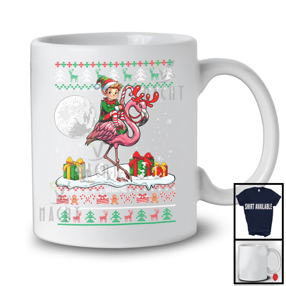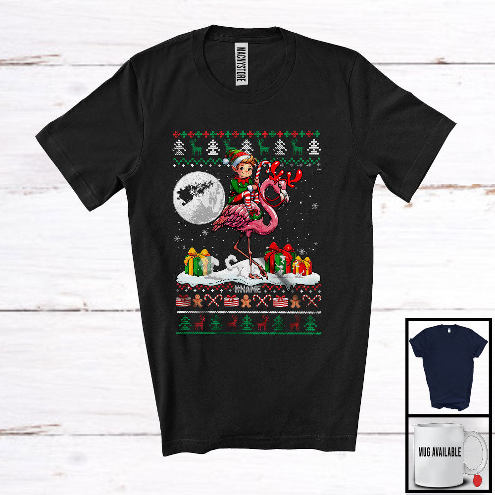 Personalized Custom Name Elf Riding Flamingo; Lovely Christmas Sweater Elf Wild Animal; X-mas Moon T-Shirt