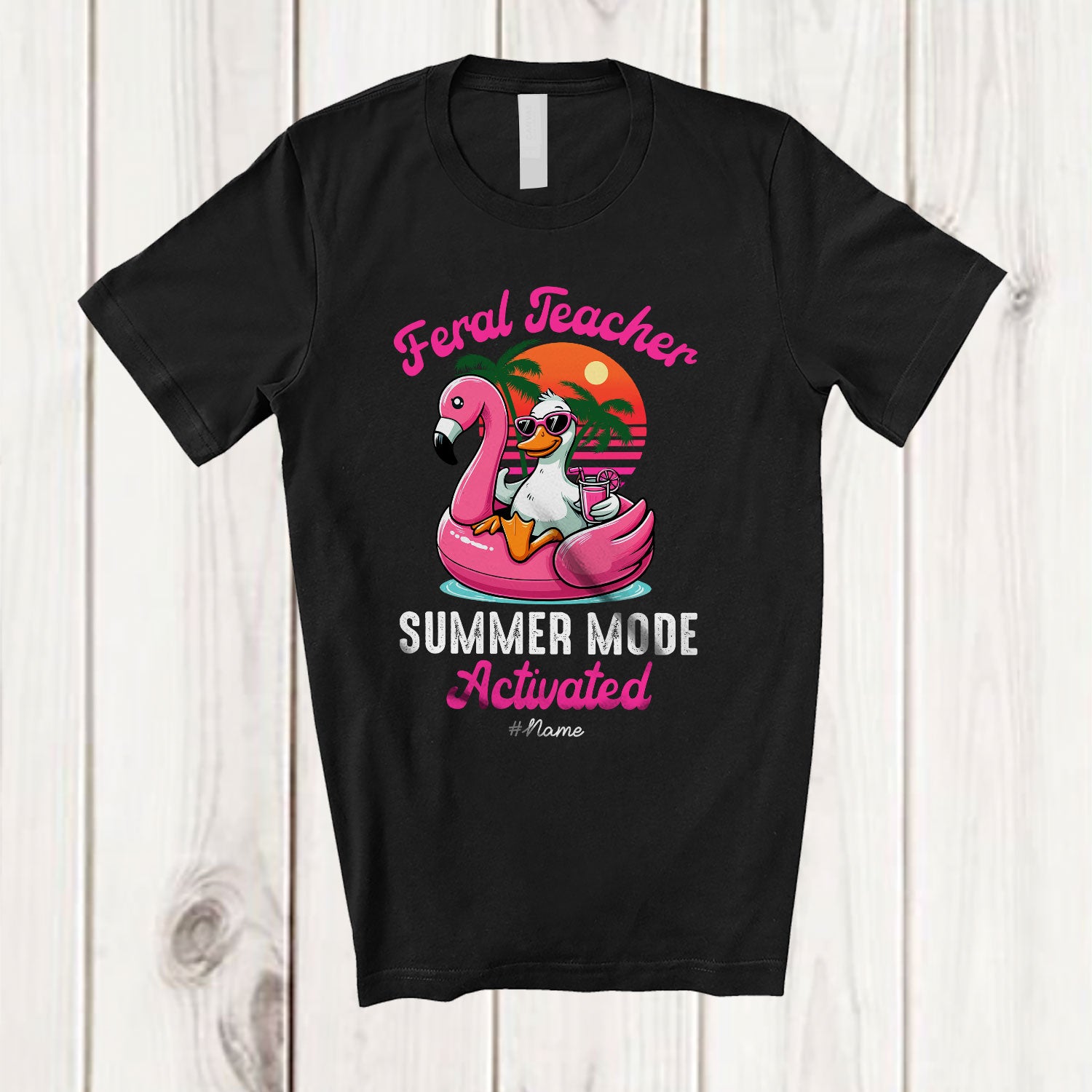 Personalized Custom Name Feral Teacher; Joyful Summer Vacation Goose On Flamingo Float T-Shirt