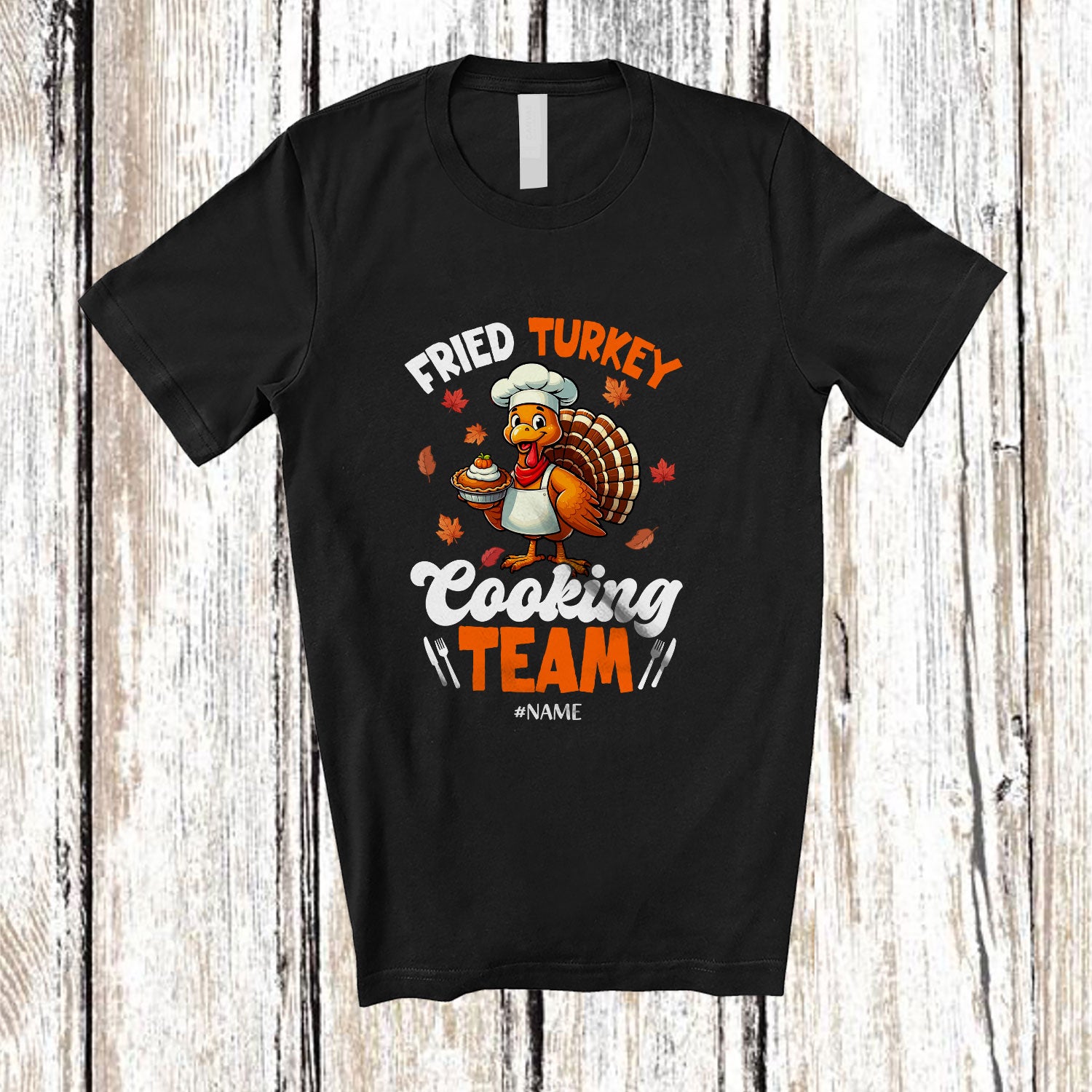 • Personalized Custom Name Fired Turkey Cooking Team; Lovely Thanksgiving Pie; Lunch Lady Chef T-Shirt. This cotton t-shirt is a durable staple product with a classic fit. One of the most popular items, it has a relaxed style made for everyday and casual wear.