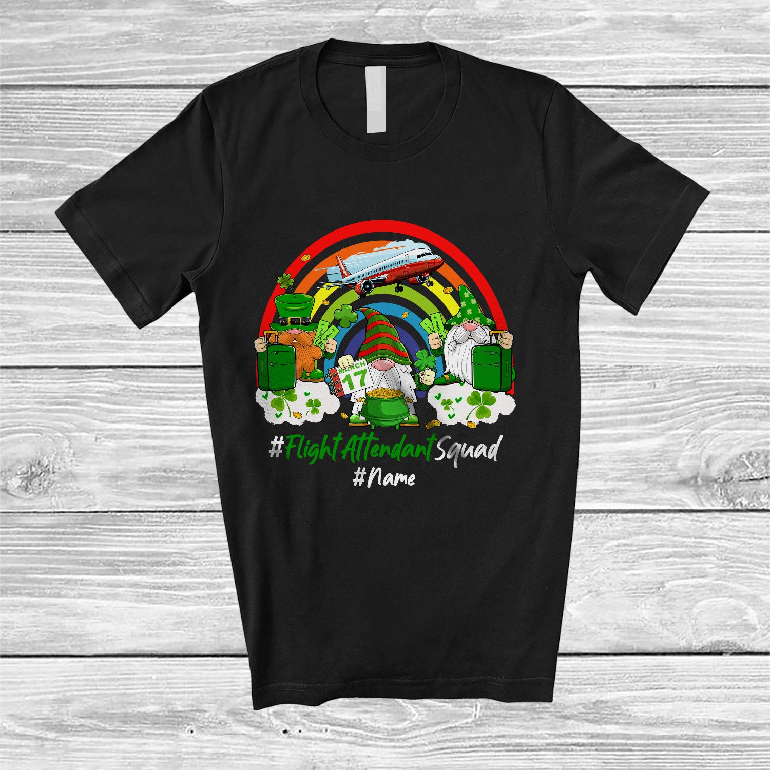 Personalized Custom Name Flight Attendant Squad; Joyful St. Patrick's Day Three Gnomes; Rainbow T-Shirt. This cotton t-shirt is a durable staple product with a classic fit. One of the most popular items, it has a relaxed style made for everyday and casual wear.