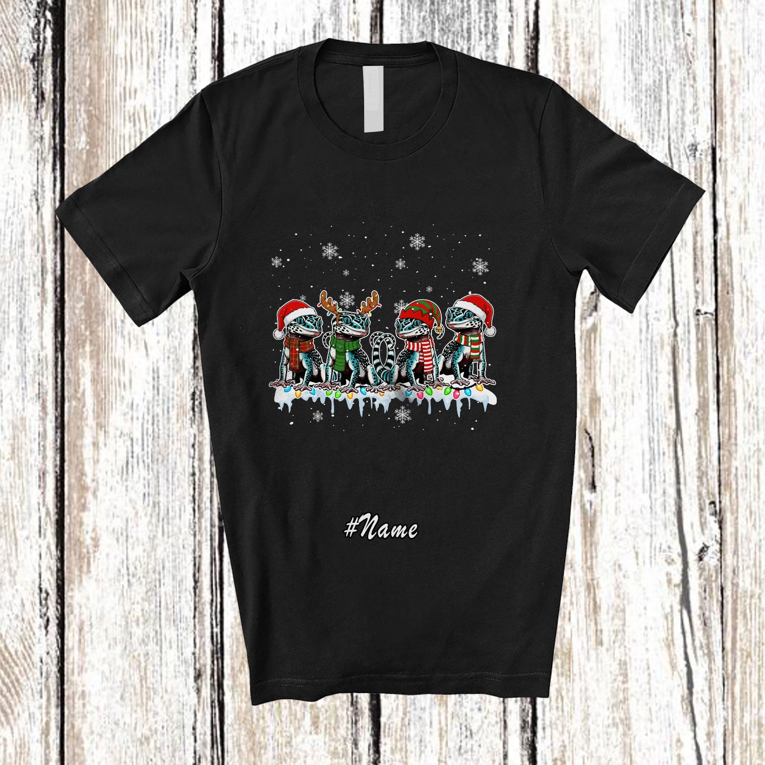Personalized Custom Name Four Santa Elf Geckos; Adorable Christmas Lights Gecko Animal T-Shirt