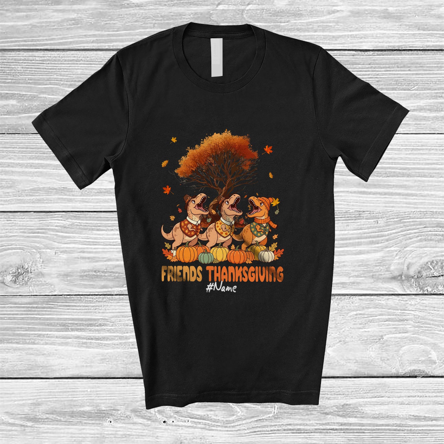 • Personalized Custom Name Friends Thanksgiving; Lovely Fall Autumn Tree Three Three T-Rex T-Shirt. This cotton t-shirt is a durable staple product with a classic fit. One of the most popular items, it has a relaxed style made for everyday and casual wear.