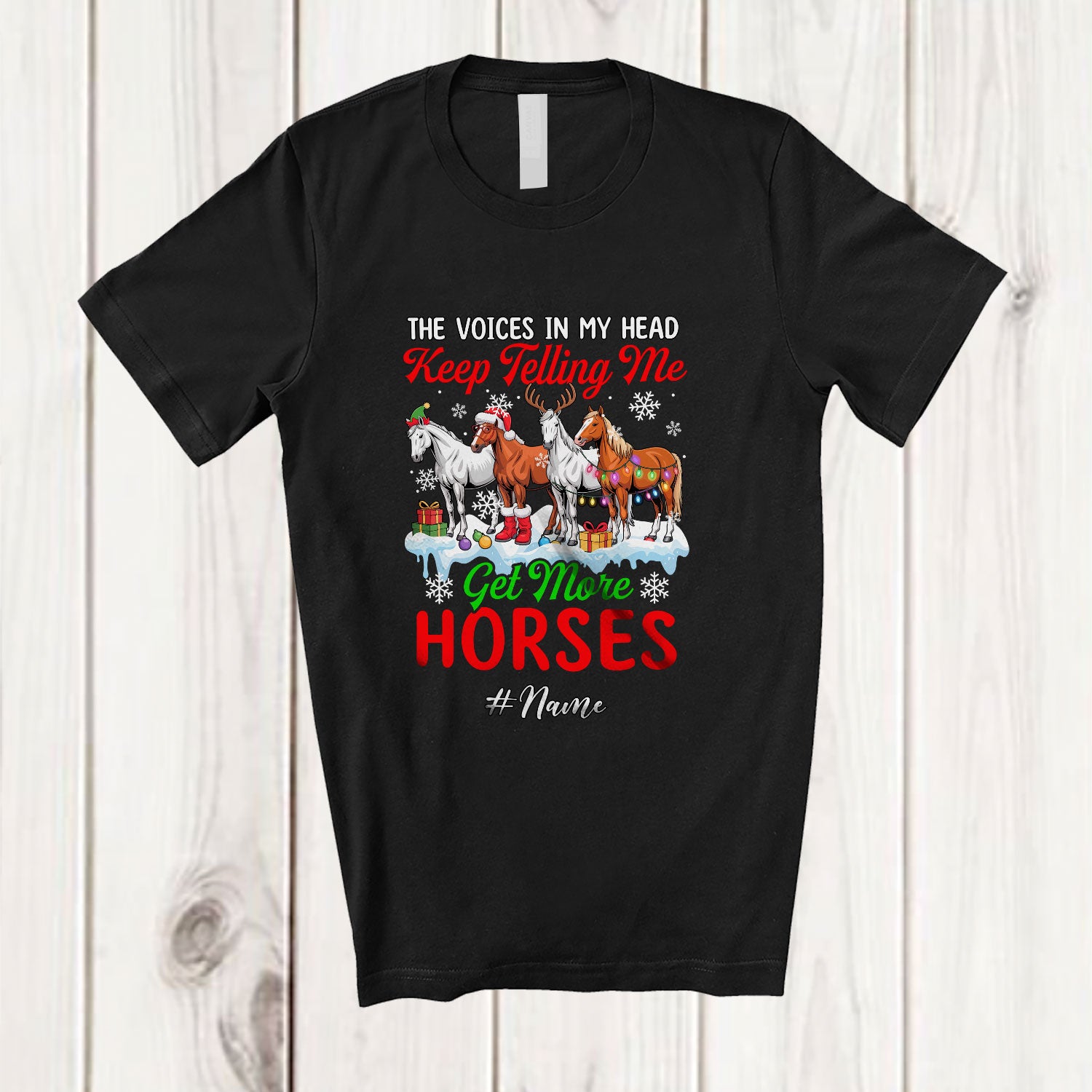 Personalized Custom Name Get More Horses; Adorable Christmas Four Santa Elf Horses Farmer T-Shirt. This cotton t-shirt is a durable staple product with a classic fit. One of the most popular items, it has a relaxed style made for everyday and casual wear.