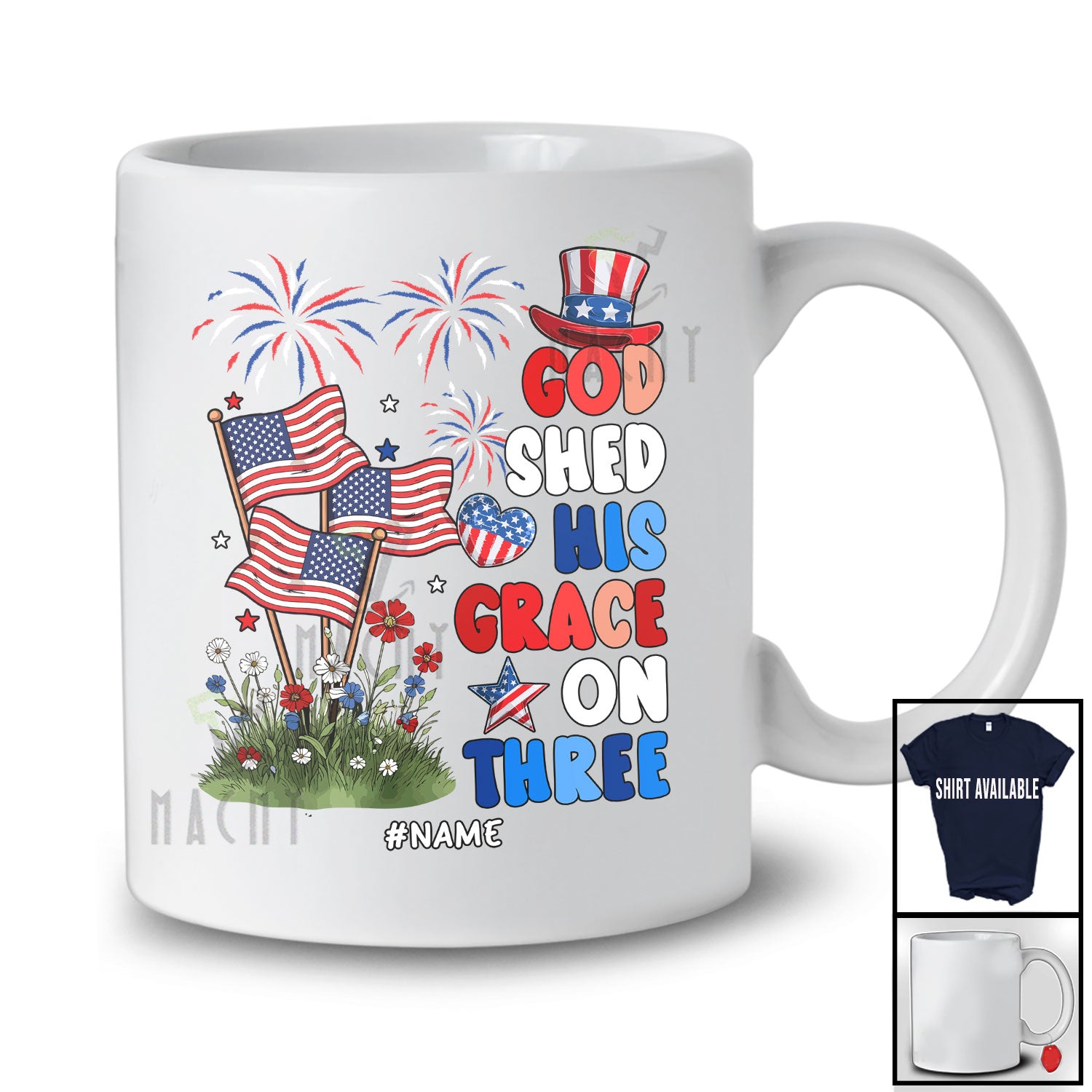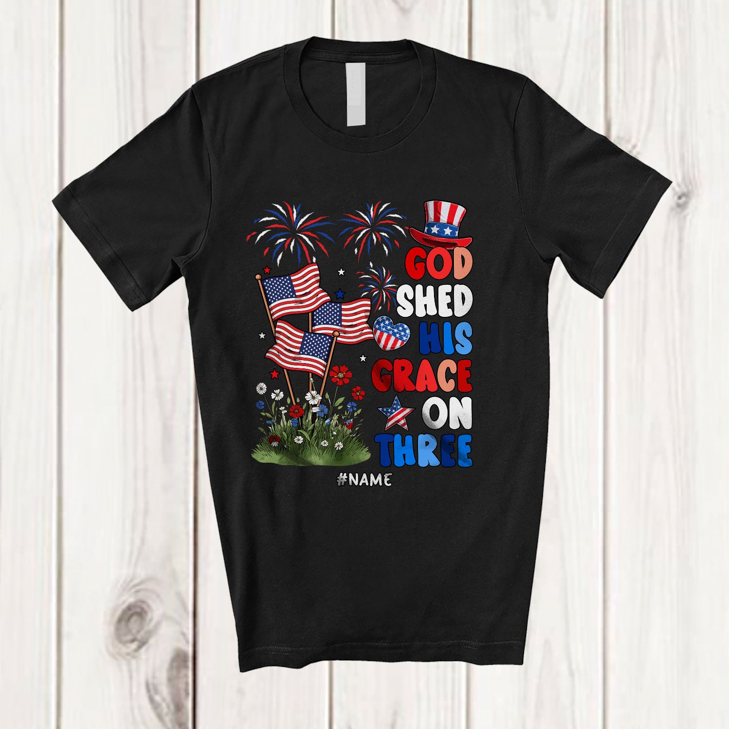 Personalized Custom Name God Shed His Grace; Lovely 4th of July Freedom American Flag; Patriotic T-Shirt. This cotton t-shirt is a durable staple product with a classic fit. One of the most popular items, it has a relaxed style made for everyday and casual wear.
