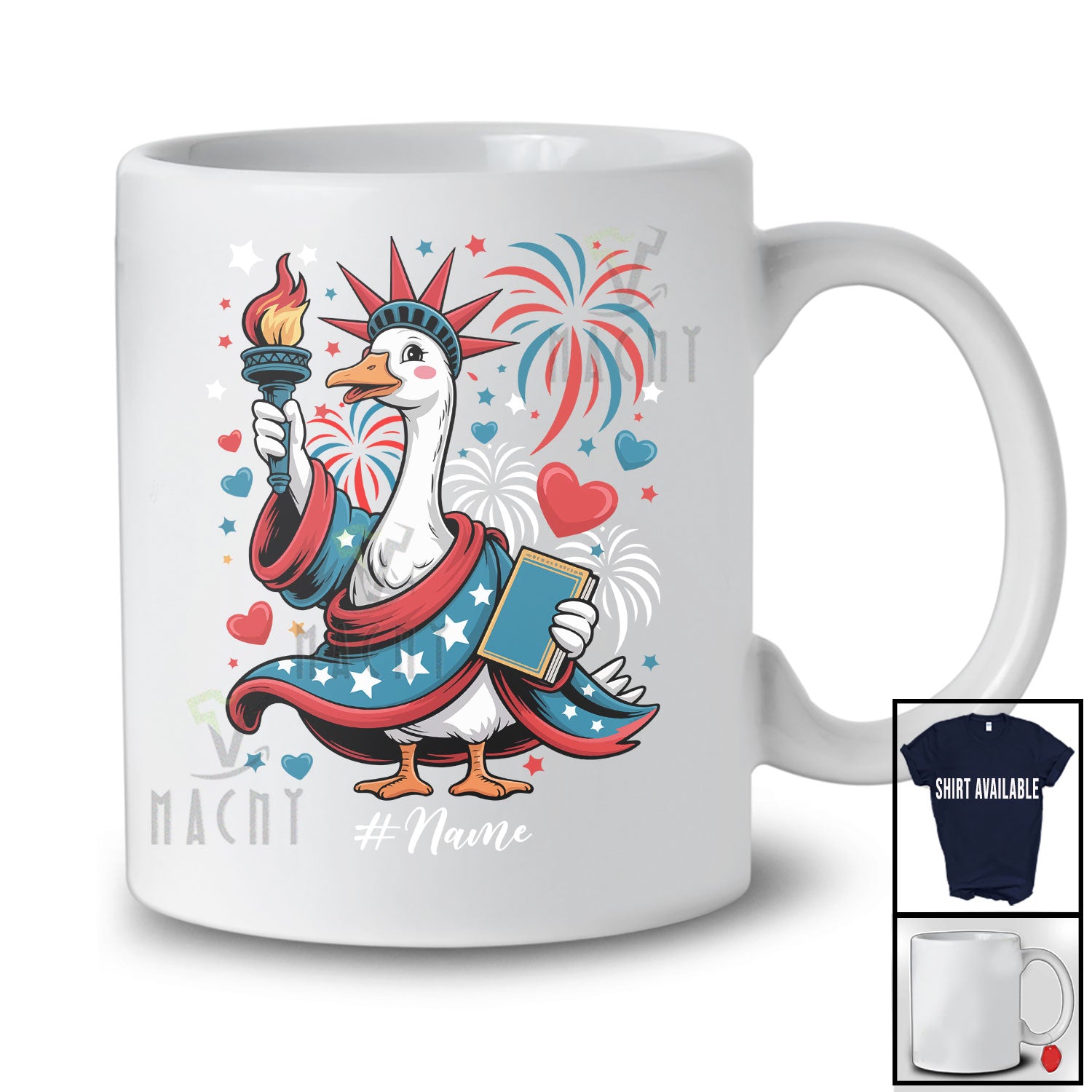Personalized Custom Name Goose Statue of Liberty; Humorous 4th of July American Fireworks; Patriotic T-Shirt. This cotton t-shirt is a durable staple product with a classic fit. One of the most popular items, it has a relaxed style made for everyday and casual wear.