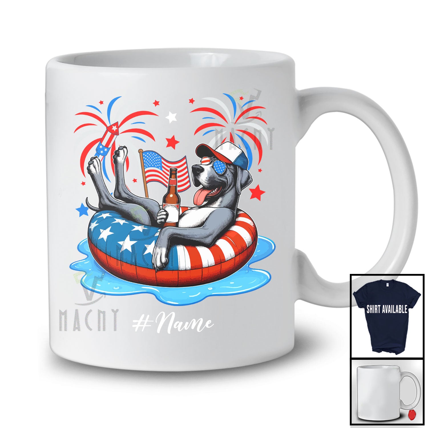 Personalized Custom Name Great Dane Drinking On Float Beach; Joyful 4th Of July Patriotic T-Shirt. This cotton t-shirt is a durable staple product with a classic fit. One of the most popular items, it has a relaxed style made for everyday and casual wear.