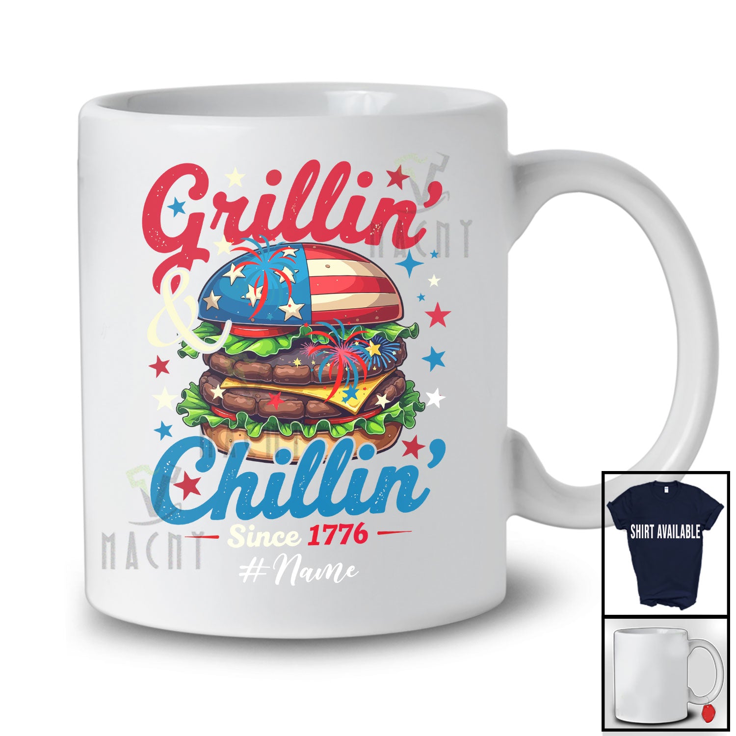 This Personalized Custom Name Grillin' and Chillin' 1776; Joyful 4th of July US Flag Hamburger; Patriotic T-Shirt is great idea gift for your family, friends in this birthday, christmas, mother's day, father's day, patrick's day or any holiday.