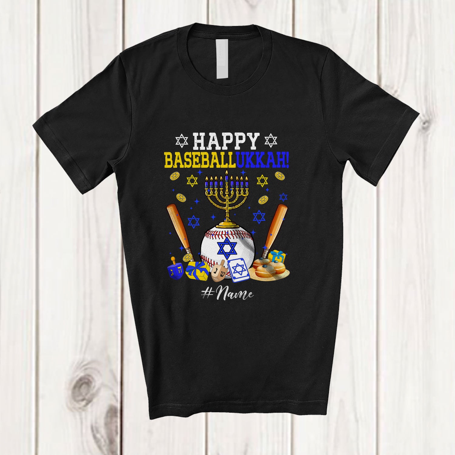 • Personalized Custom Name Happy Baseballukkah; Joyful Hanukkah Lights Baseball Ball Player T-Shirt. This cotton t-shirt is a durable staple product with a classic fit. One of the most popular items, it has a relaxed style made for everyday and casual wear.