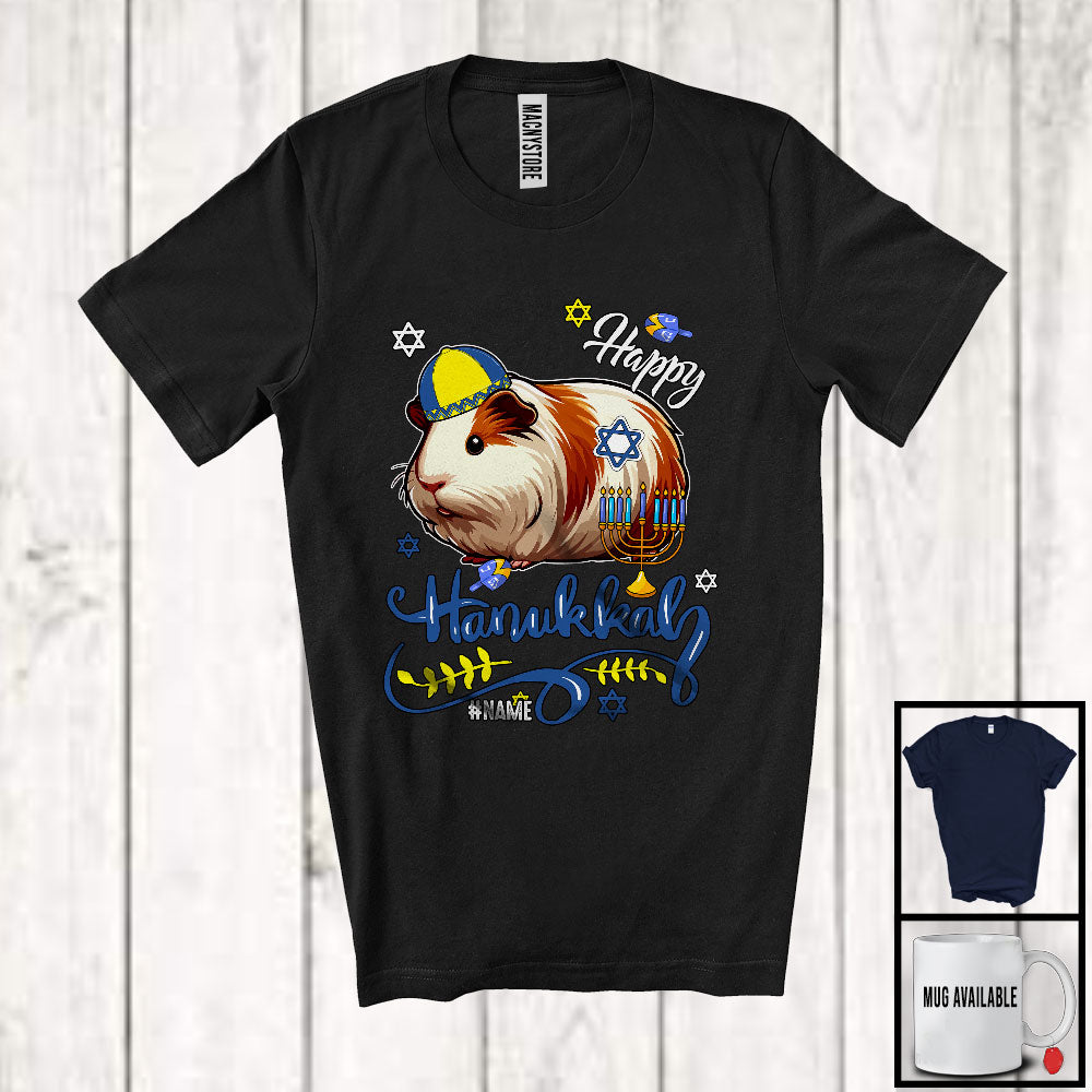 • Personalized Custom Name Happy Hanukkah; Adorable Chanukah Guinea Pig With Menorah; Animal T-Shirt. This cotton t-shirt is a durable staple product with a classic fit. One of the most popular items, it has a relaxed style made for everyday and casual wear.