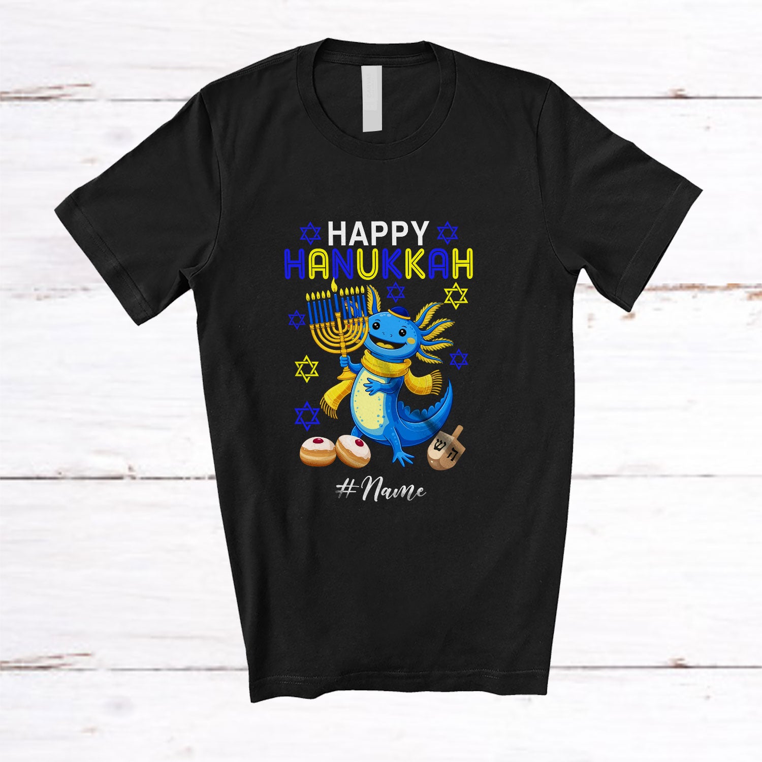 • Personalized Custom Name Happy Hanukkah; Adorable Chanukah Lights Axolotl Animal; Family T-Shirt. This cotton t-shirt is a durable staple product with a classic fit. One of the most popular items, it has a relaxed style made for everyday and casual wear.