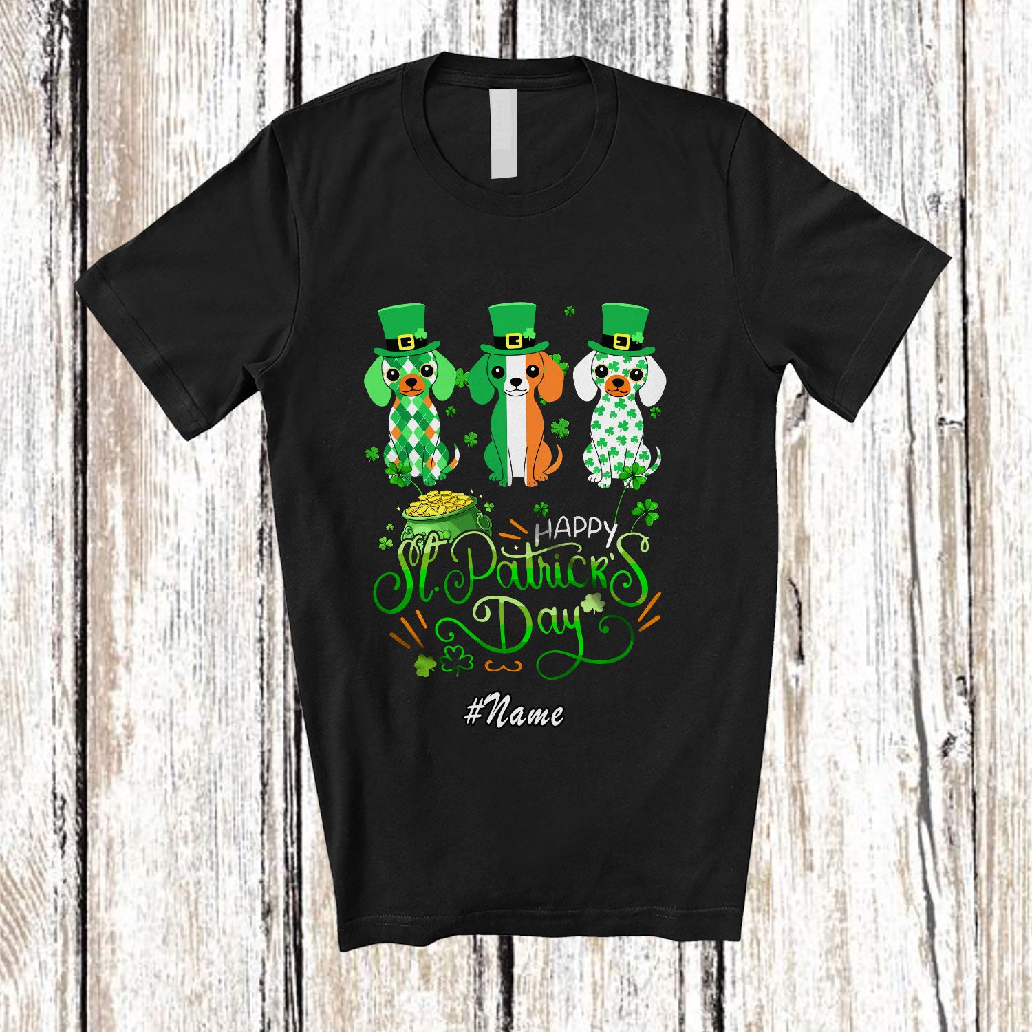 Personalized Custom Name Happy St. Patrick's Day; Humorous Three Ireland Flag Dachshund T-Shirt. This cotton t-shirt is a durable staple product with a classic fit. One of the most popular items, it has a relaxed style made for everyday and casual wear.