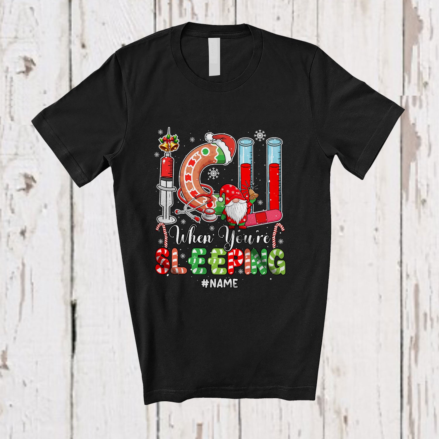 Personalized Custom Name I.C.U When You're Sleeping; Humorous Christmas Snowing Gnome Nurse T-Shirt