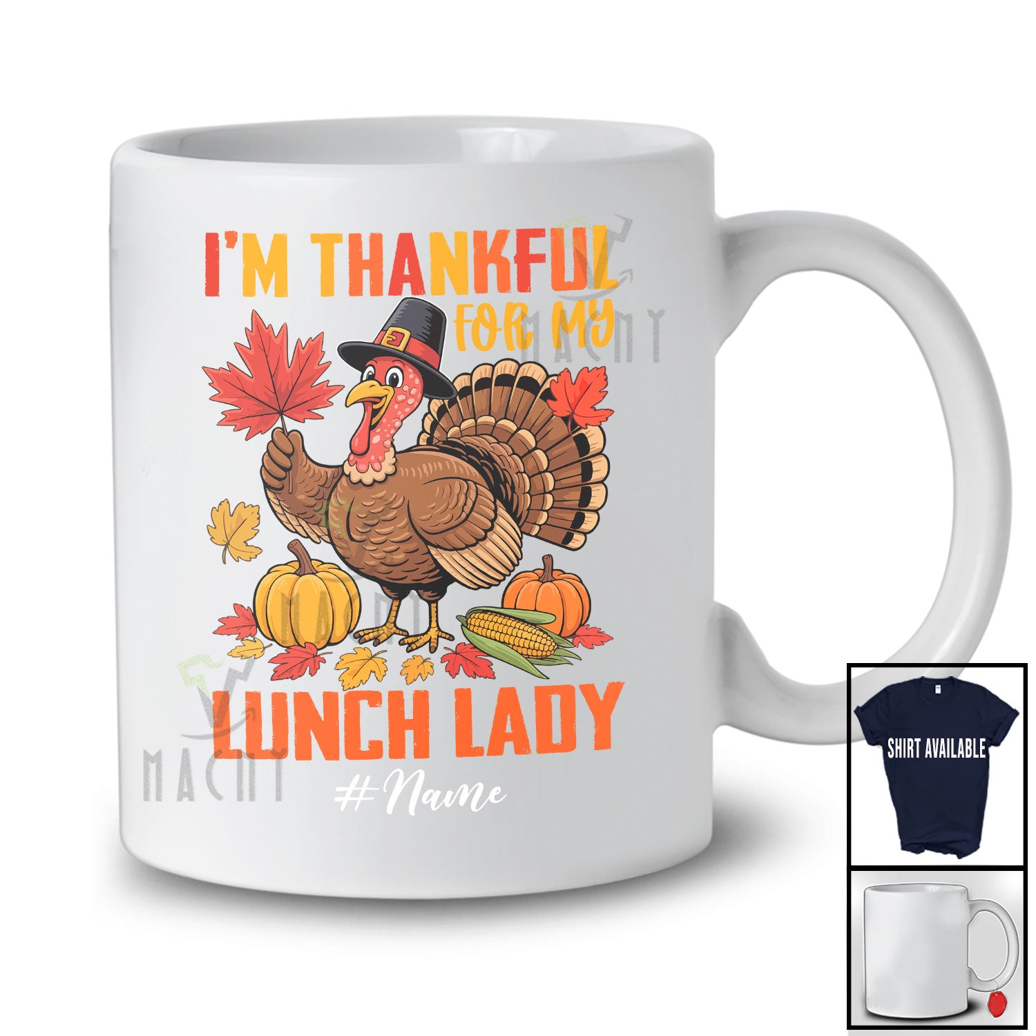 Personalized Custom Name I'm Thankful For My Lunch Lady; Proud Thanksgiving Turkey Pumpkin T-Shirt. This cotton t-shirt is a durable staple product with a classic fit. One of the most popular items, it has a relaxed style made for everyday and casual wear.