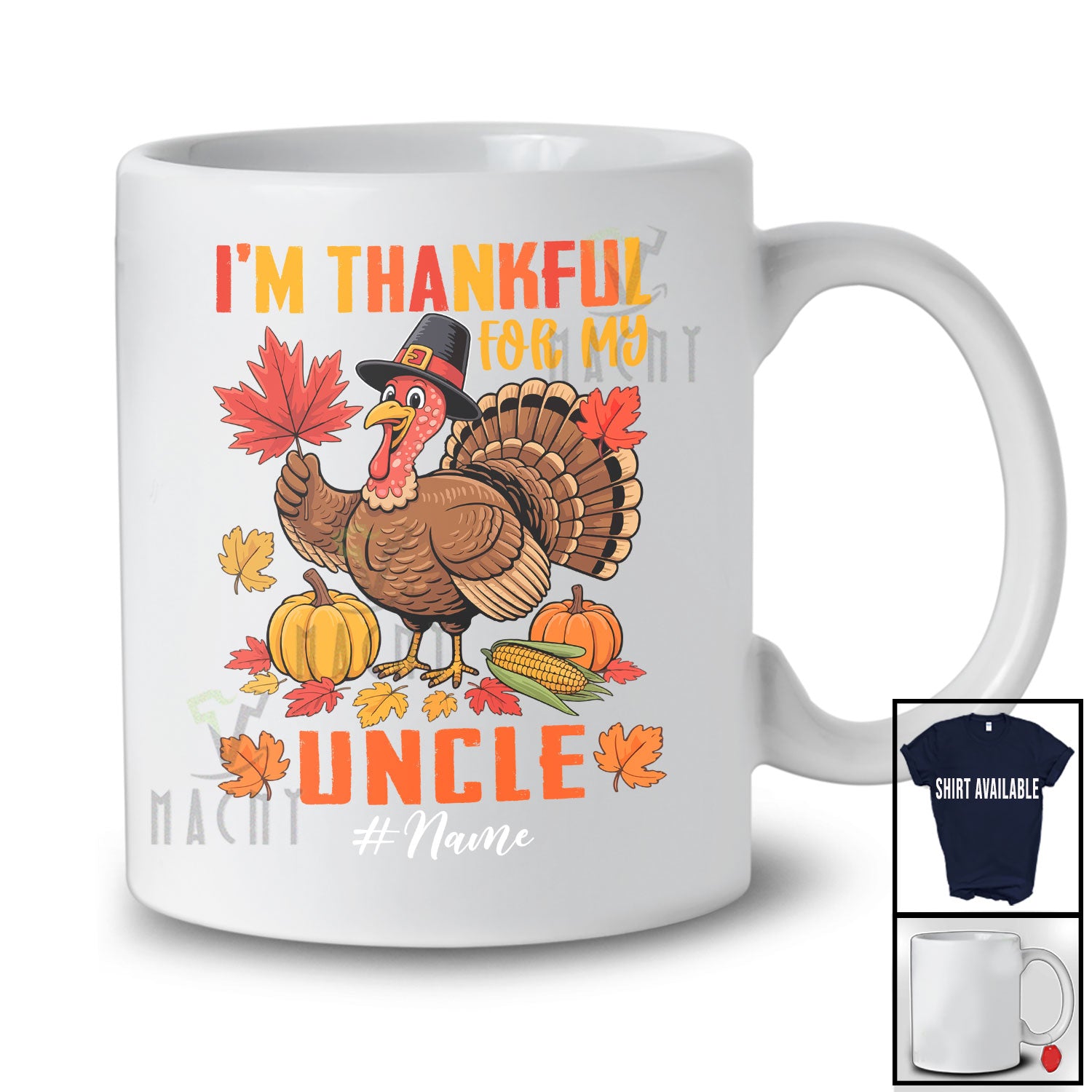 Personalized Custom Name I'm Thankful For My Uncle; Proud Thanksgiving Turkey Pumpkin T-Shirt. This cotton t-shirt is a durable staple product with a classic fit. One of the most popular items, it has a relaxed style made for everyday and casual wear.
