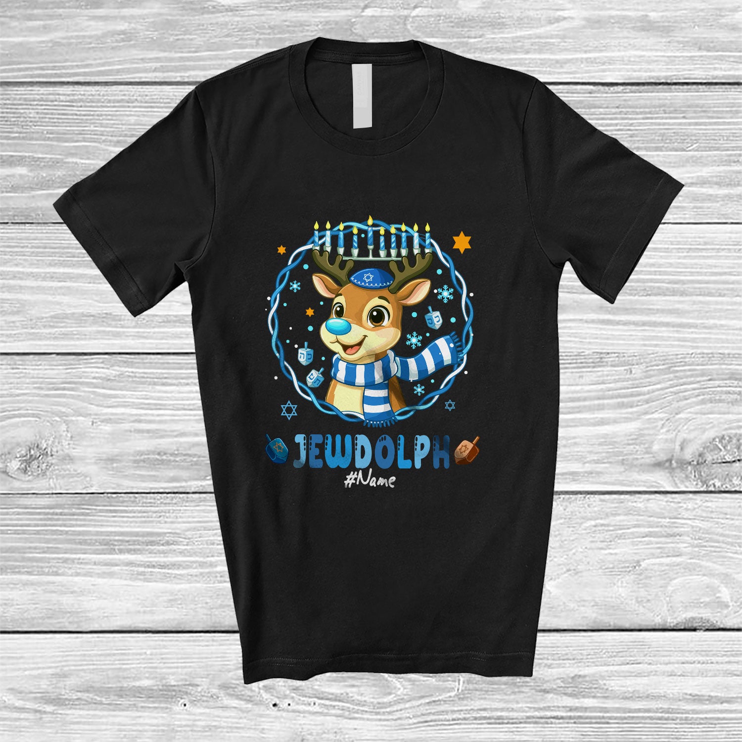 Personalized Custom Name Jewdolph; Awesome Hanukkah Lights Reindeer; Family Group T-Shirt. This cotton t-shirt is a durable staple product with a classic fit. One of the most popular items, it has a relaxed style made for everyday and casual wear.